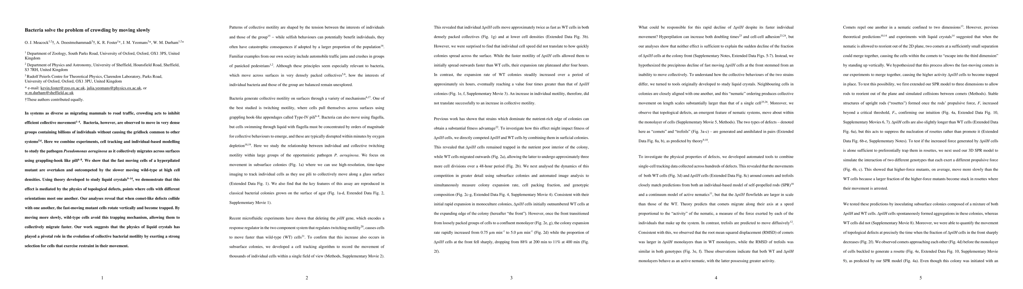 This study reveals that bacteria like Pseudomonas aeruginosa migrate efficiently in dense groups by moving slowly, avoiding the gridlock seen in other crowded systems. Through experiments and modeling, it is shown that slower-moving wild-type cells outcompete faster-moving mutants by avoiding trapping in topological defects, suggesting that the physics of liquid crystals has influenced the evolution of bacterial motility.