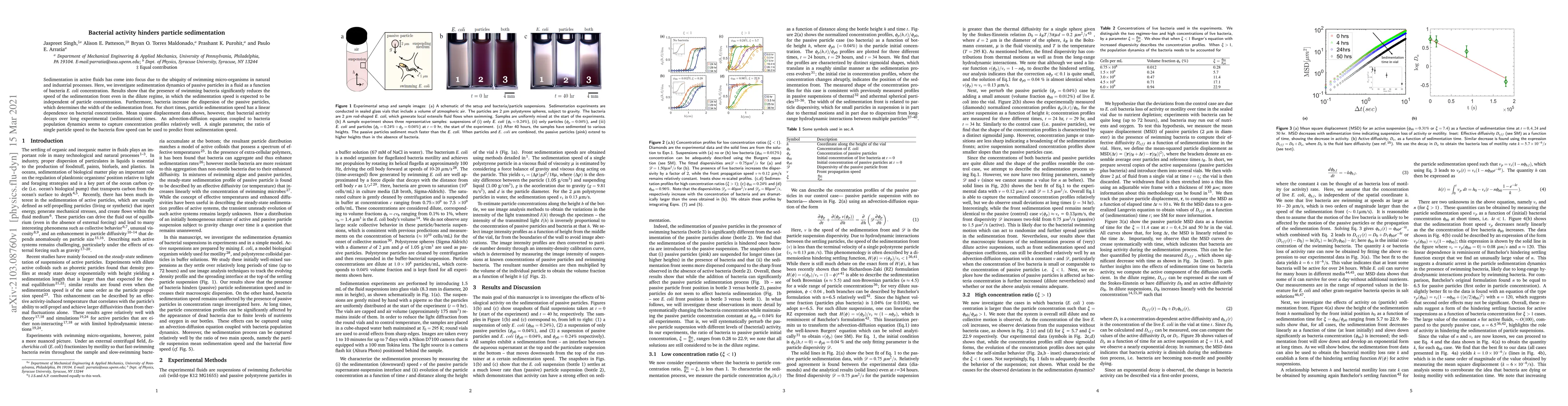 This paper investigates how bacterial activity, specifically from E. coli, affects the sedimentation dynamics of passive particles in fluid. The presence of swimming bacteria significantly slows down and broadens the sedimentation front, even in low bacterial concentrations, due to increased particle dispersion.