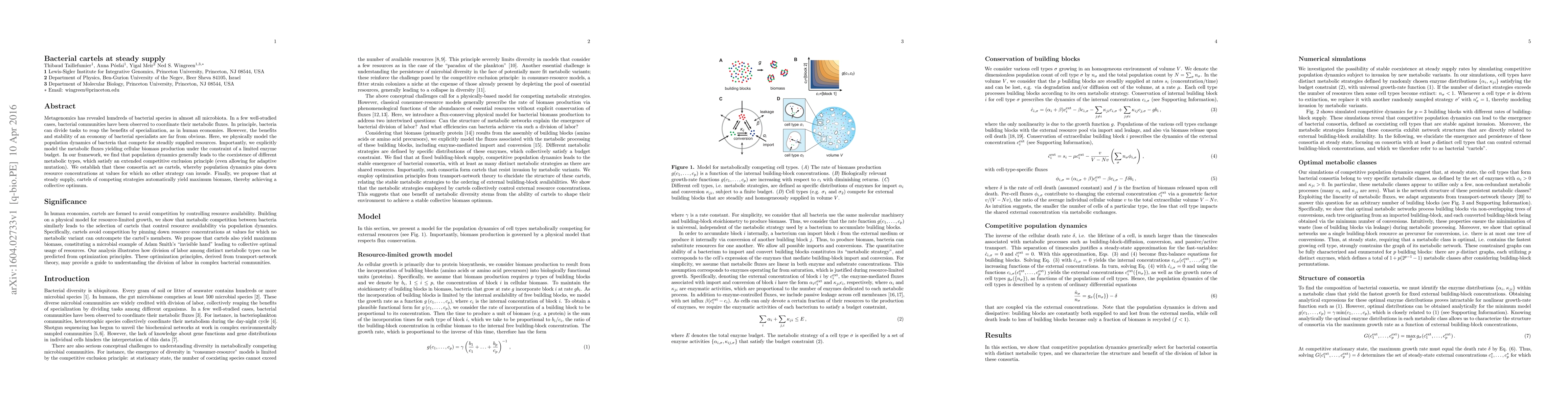 This paper models bacterial population dynamics under steady resource supply, finding that different metabolic types coexist and form cartels that stabilize resource concentrations. These consortia maximize collective biomass production, suggesting an optimal collective outcome from competition.