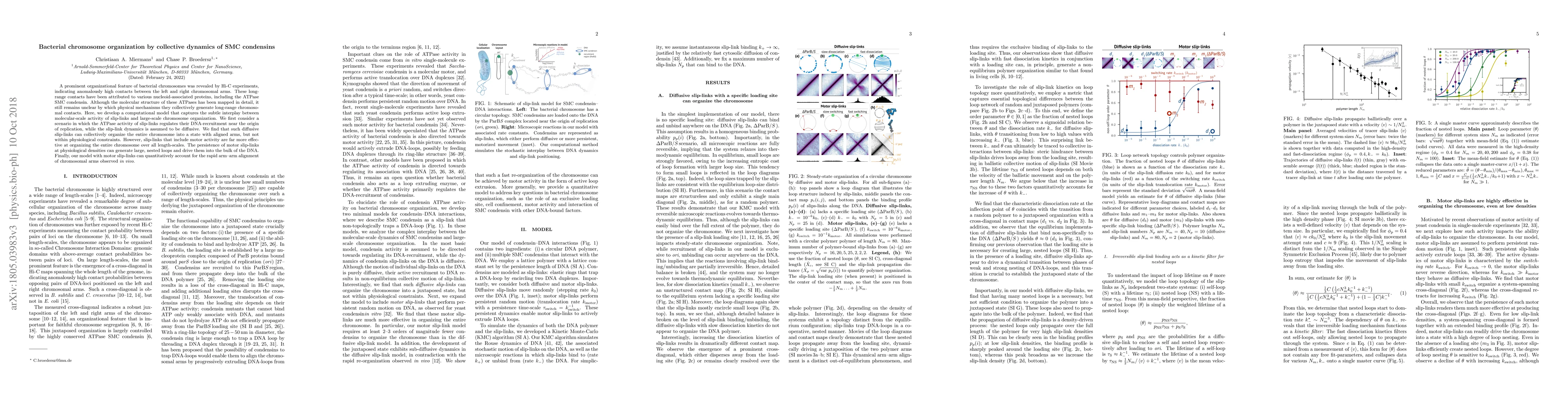 This paper reveals how bacterial chromosomes are organized through the collective dynamics of SMC condensin proteins. Using a computational model, it shows that motor-active slip-links are more effective than diffusive slip-links in organizing chromosomal arms into aligned states, explaining the observed long-range contacts and rapid arm-arm alignment in vivo.