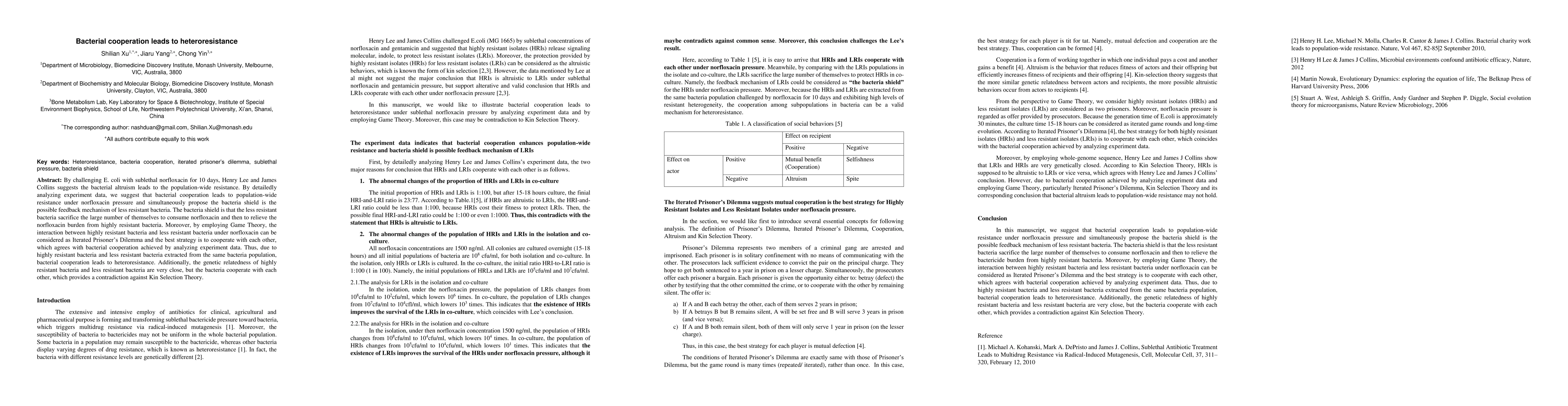 Bacterial cooperation leads to population-wide resistance when less-resistant bacteria sacrifice themselves to shield highly-resistant ones from norfloxacin, resulting in heteroresistance.