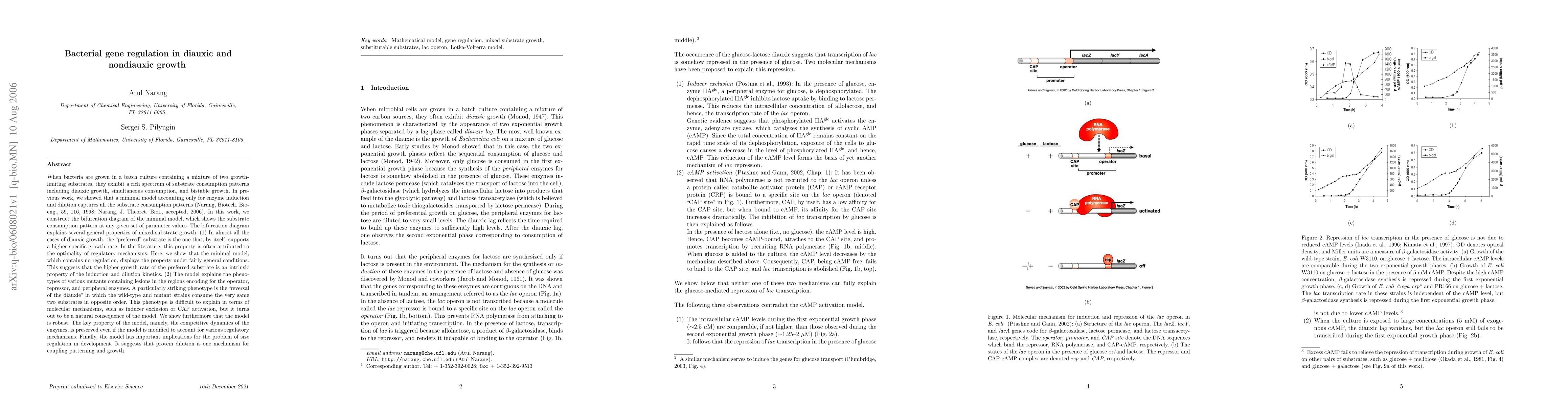 When bacteria are grown on a mixture of two growth-limiting substrates, they exhibit a rich spectrum of substrate consumption patterns including diauxic growth, simultaneous consumption, and bistable growth. In previous work, we showed that a minimal model accounting only for enzyme induction and dilution captures all the substrate consumption patterns. Here, we construct the bifurcation diagram of the minimal model. The bifurcation diagram explains several general properties of mixed-substrate growth. (1) In almost all cases of diauxic growth, the "preferred" substrate is the one that, by itself, supports a higher specific growth rate. In the literature, this property is often attributed to optimality of regulatory mechanisms. Here, we show that the minimal model, which contains only induction, displays the property under fairly general conditions. This suggests that the higher growth rate of the preferred substrate is an intrinsic property of the induction and dilution kinetics.(2) The model explains the phenotypes of various mutants containing lesions in the regions encoding for the operator, repressor, and peripheral enzymes. A particularly striking phenotype is the "reversal of the diauxie" in which the wild-type and mutant strains consume the very same two substrates in opposite order. This phenotype is difficult to explain in terms of molecular mechanisms, but it turns out to be a natural consequence of the model. We show furthermore that the model is robust. The key property of the model, namely, the competitive dynamics of the enzymes, is preserved even if the model is modified to account for various regulatory mechanisms. Finally, the model has important implications for size regulation in development, since it suggests that protein dilution is one mechanism for coupling patterning and growth.