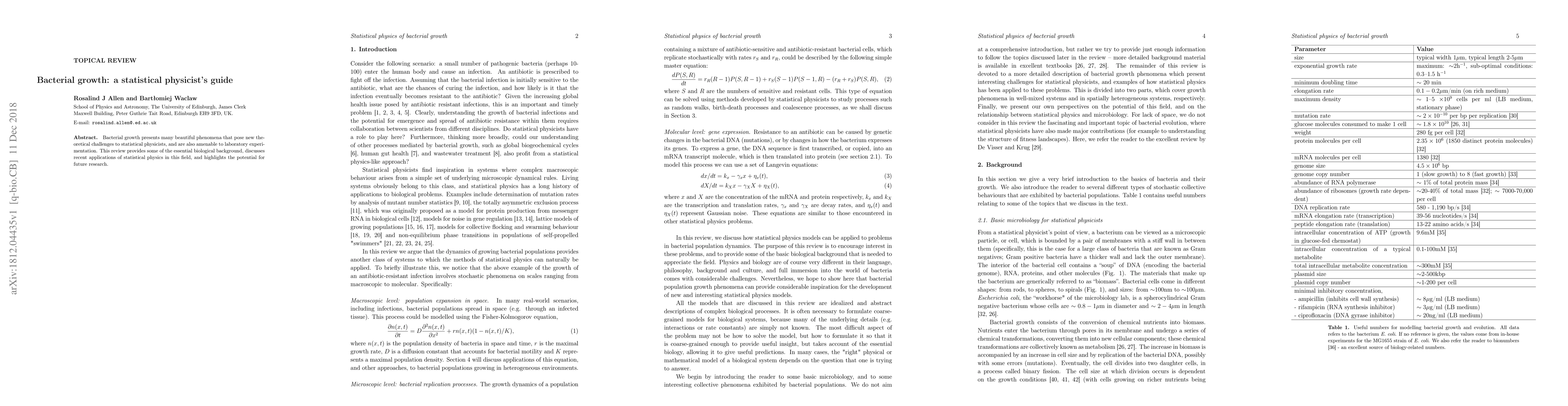 The paper presents a comprehensive review of statistical physics approaches applied to bacterial growth, including mathematical models and their implications.