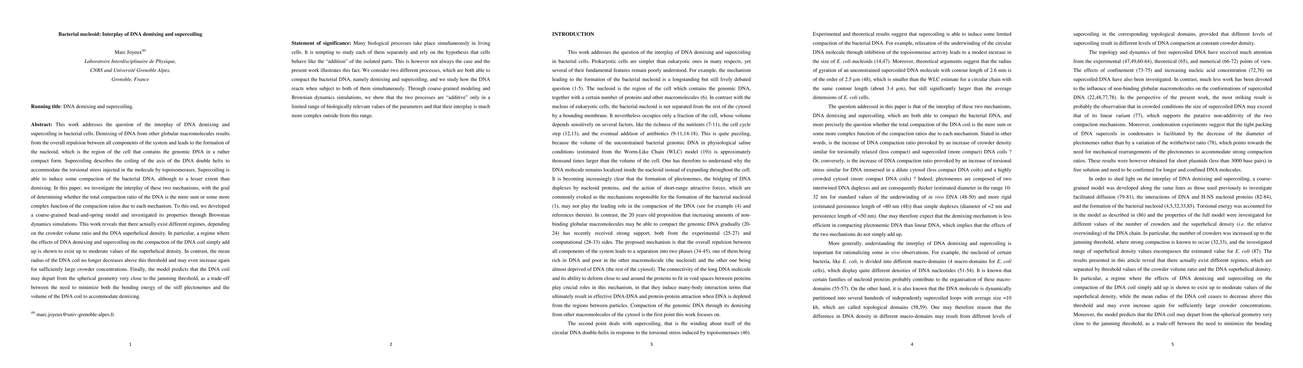 This research explores how DNA demixing and supercoiling interact to compact bacterial DNA, revealing different compaction regimes based on crowder volume and superhelical density. The study shows that while both mechanisms can additively compact DNA up to a certain point, beyond this threshold, supercoiling's effect diminishes, and the DNA coil may even expand or change shape near the jamming point.