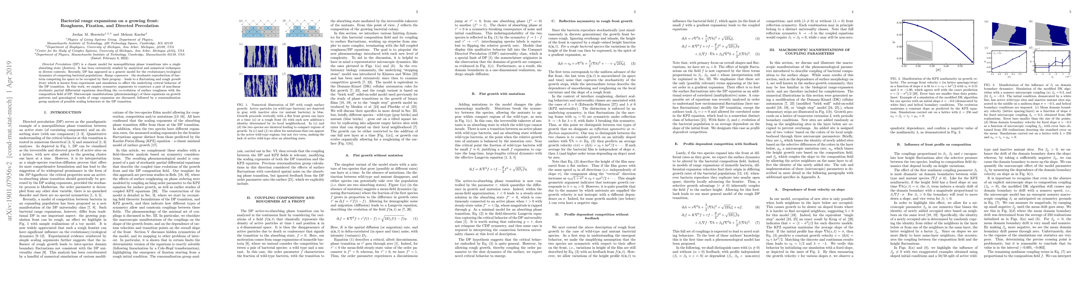 Directed Percolation (DP) is a classic model for nonequilibrium phase transitions into a single absorbing state (fixation). It has been extensively studied by analytical and numerical techniques in diverse contexts. Recently, DP has appeared as a generic model for the evolutionary/ecological dynamics of competing bacterial populations. Range expansion -- the stochastic reproduction of bacteria competing for space to be occupied by their progeny -- leads to a fluctuating and rough growth front, which is known from experiment and simulation to affect the underlying critical behavior of the DP transition. In this work, we employ symmetry arguments to construct a pair of non-linear stochastic partial differential equations describing the co-evolution of surface roughness with the composition field of DP. Macroscopic manifestations (phenomenology) of these equations on growth patterns and genealogical tracks of range expansion are discussed; followed by a renormalization group analysis of possible scaling behaviors at the DP transition.
