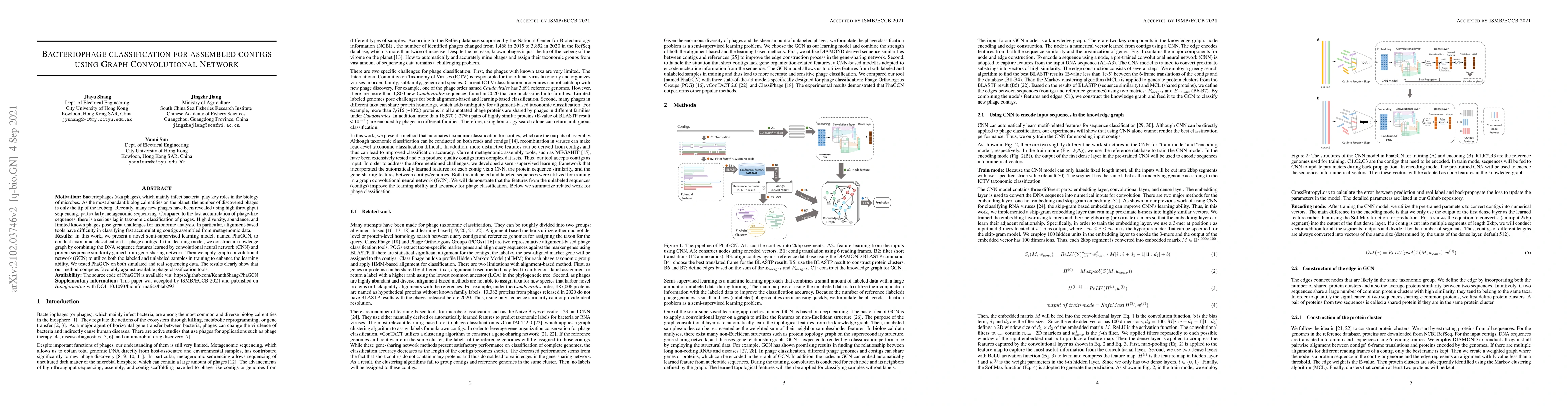 This paper introduces PhaGCN, a semi-supervised learning model using graph convolutional networks to classify phage contigs from metagenomic sequencing data. The model combines DNA sequence features and protein sequence similarity to enhance classification, outperforming existing tools in both simulated and real datasets.