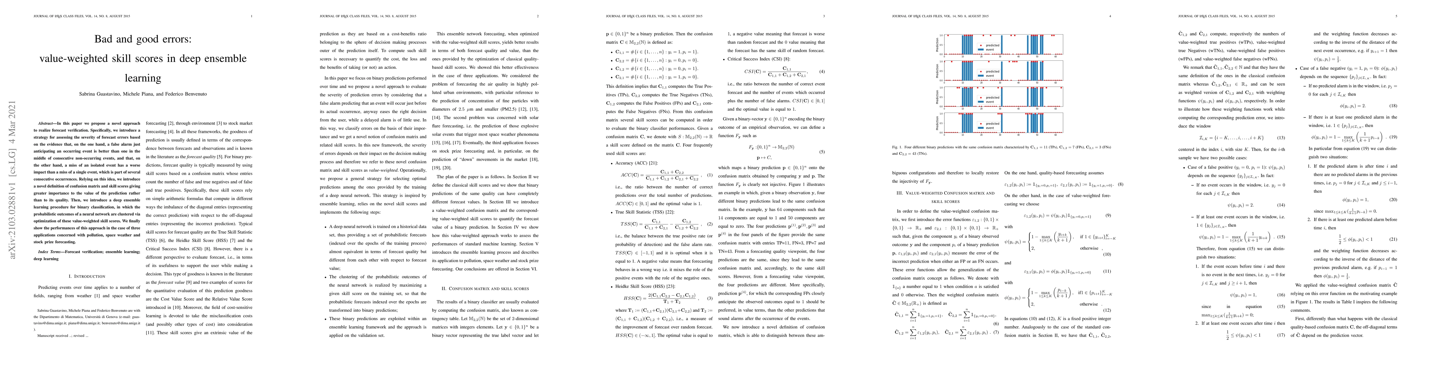 In this paper we propose a novel approach to realize forecast verification. Specifically, we introduce a strategy for assessing the severity of forecast errors based on the evidence that, on the one hand, a false alarm just anticipating an occurring event is better than one in the middle of consecutive non-occurring events, and that, on the other hand, a miss of an isolated event has a worse impact than a miss of a single event, which is part of several consecutive occurrences. Relying on this idea, we introduce a novel definition of confusion matrix and skill scores giving greater importance to the value of the prediction rather than to its quality. Then, we introduce a deep ensemble learning procedure for binary classification, in which the probabilistic outcomes of a neural network are clustered via optimization of these value-weighted skill scores. We finally show the performances of this approach in the case of three applications concerned with pollution, space weather and stock prize forecasting.