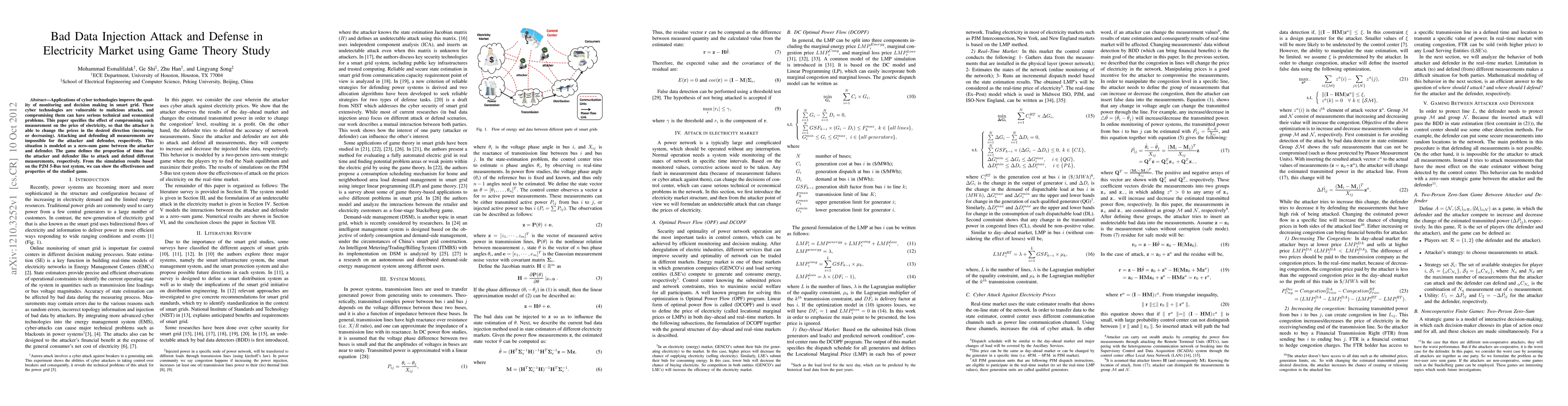 This paper investigates a bad data injection attack in electricity markets using game theory, finding that compromising measurements can manipulate prices, while simulating the effectiveness of defensive strategies based on a PJM 5 Bus test system.