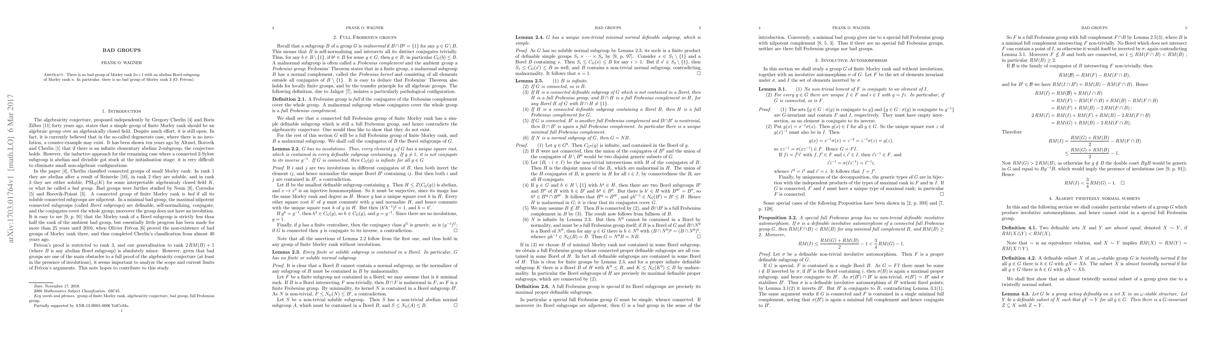 There is no bad group of Morley rank 2n+1 with an abelian Borel subgroup of Morley rank n. In particular, there is no bad group of Morley rank 3 (O. Fr{\'e}con).