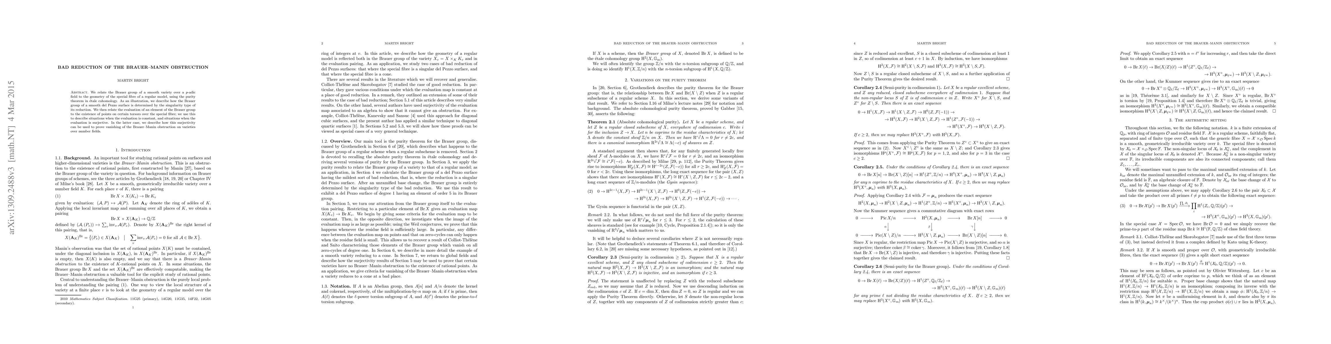 We relate the Brauer group of a smooth variety over a p-adic field to the geometry of the special fibre of a regular model, using the purity theorem in \'etale cohomology. As an illustration, we describe how the Brauer group of a smooth del Pezzo surface is determined by the singularity type of its reduction. We then relate the evaluation of an element of the Brauer group to the existence of points on certain torsors over the special fibre; we use this to describe situations when the evaluation is constant, and situations when the evaluation is surjective. In the latter case, we describe how this surjectivity can be used to prove vanishing of the Brauer-Manin obstruction on varieties over number fields.