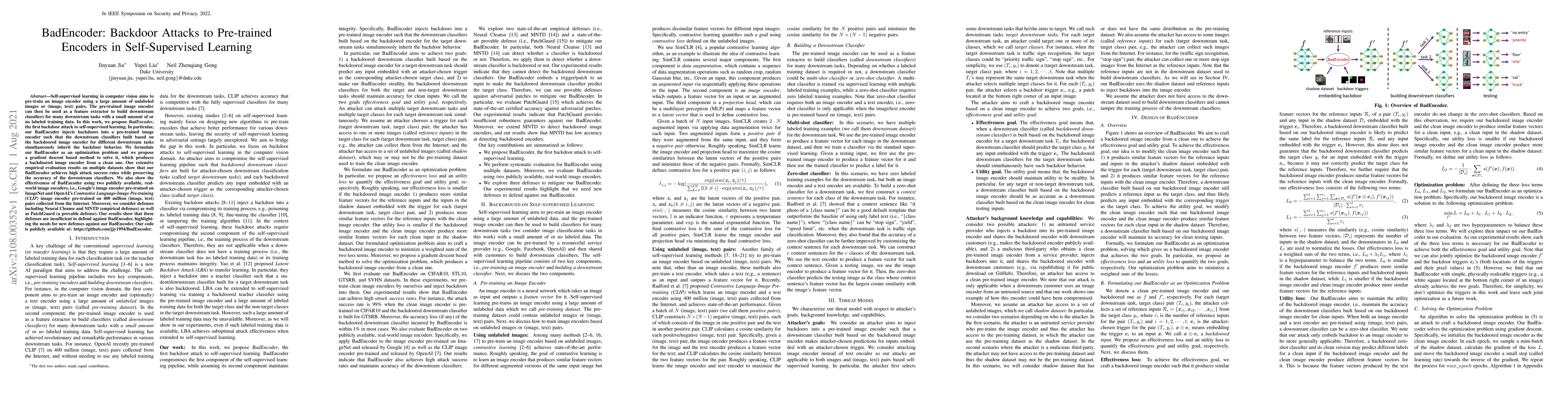 Self-supervised learning in computer vision aims to pre-train an image encoder using a large amount of unlabeled images or (image, text) pairs. The pre-trained image encoder can then be used as a feature extractor to build downstream classifiers for many downstream tasks with a small amount of or no labeled training data. In this work, we propose BadEncoder, the first backdoor attack to self-supervised learning. In particular, our BadEncoder injects backdoors into a pre-trained image encoder such that the downstream classifiers built based on the backdoored image encoder for different downstream tasks simultaneously inherit the backdoor behavior. We formulate our BadEncoder as an optimization problem and we propose a gradient descent based method to solve it, which produces a backdoored image encoder from a clean one. Our extensive empirical evaluation results on multiple datasets show that our BadEncoder achieves high attack success rates while preserving the accuracy of the downstream classifiers. We also show the effectiveness of BadEncoder using two publicly available, real-world image encoders, i.e., Google's image encoder pre-trained on ImageNet and OpenAI's Contrastive Language-Image Pre-training (CLIP) image encoder pre-trained on 400 million (image, text) pairs collected from the Internet. Moreover, we consider defenses including Neural Cleanse and MNTD (empirical defenses) as well as PatchGuard (a provable defense). Our results show that these defenses are insufficient to defend against BadEncoder, highlighting the needs for new defenses against our BadEncoder. Our code is publicly available at: https://github.com/jjy1994/BadEncoder.