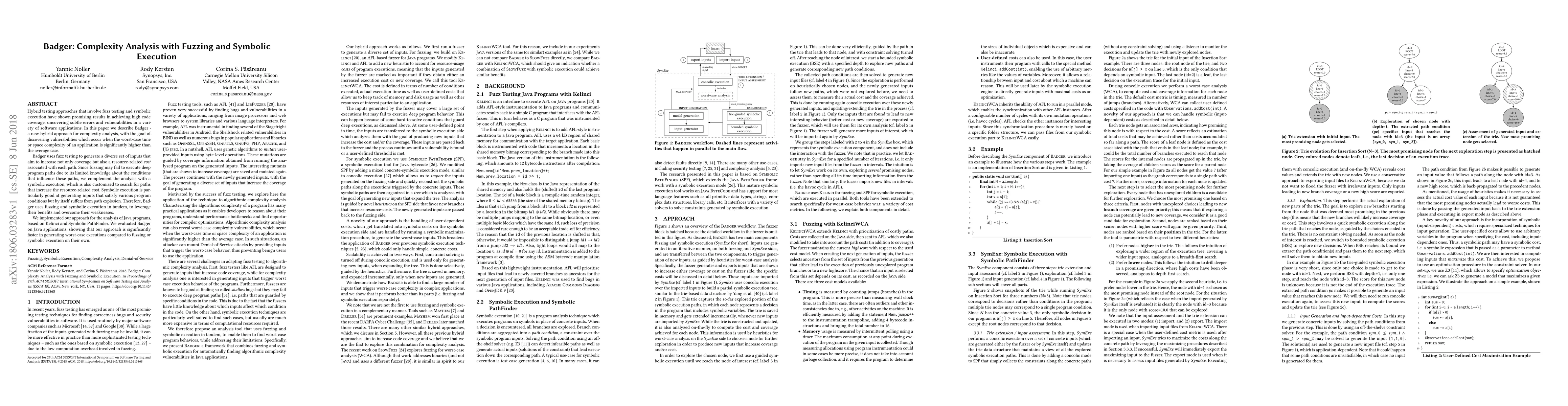 Badger is a hybrid testing approach for complexity analysis that extends the Kelinci fuzzer with worst-case analysis and uses a modified version of Symbolic Path Finder to import, analyze, and generate new inputs from the fuzzer that increase both coverage and execution cost. It supports various cost models, including time and memory consumption, and allows the specification of input-dependent costs.