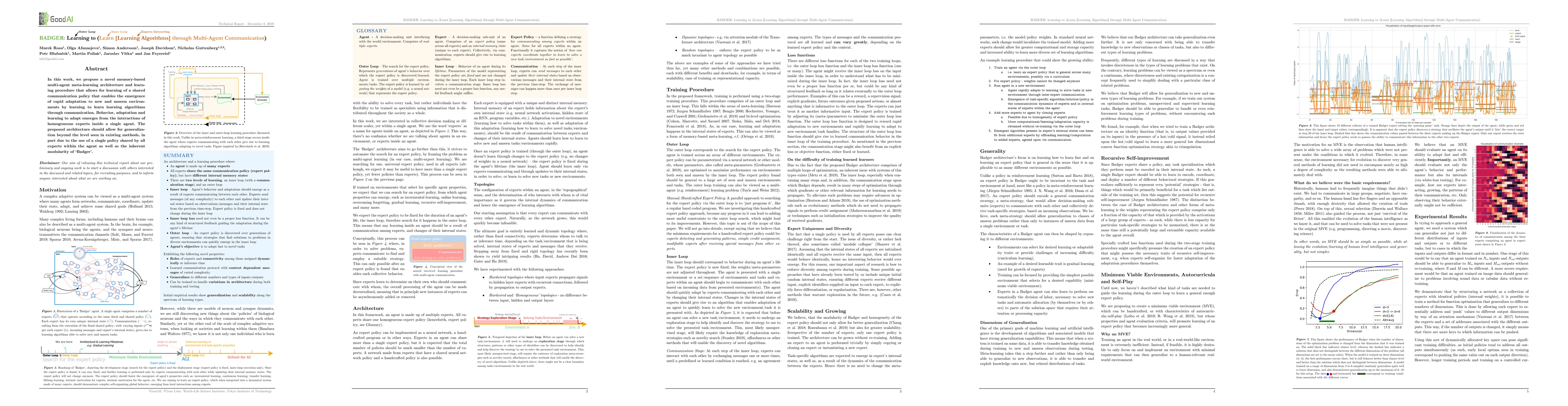 In this work, we propose a novel memory-based multi-agent meta-learning architecture and learning procedure that allows for learning of a shared communication policy that enables the emergence of rapid adaptation to new and unseen environments by learning to learn learning algorithms through communication. Behavior, adaptation and learning to adapt emerges from the interactions of homogeneous experts inside a single agent. The proposed architecture should allow for generalization beyond the level seen in existing methods, in part due to the use of a single policy shared by all experts within the agent as well as the inherent modularity of 'Badger'.