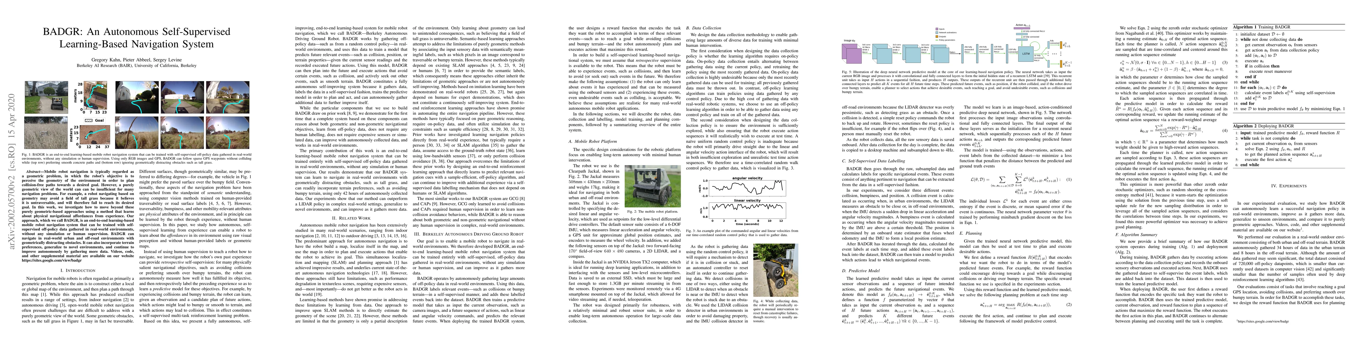 BADGR is an autonomous self-supervised learning-based navigation system that moves beyond purely geometric navigation by learning physical navigational affordances from real-world experience. It can navigate urban and off-road environments without human supervision, incorporating terrain preferences, generalizing to new settings, and improving autonomously.