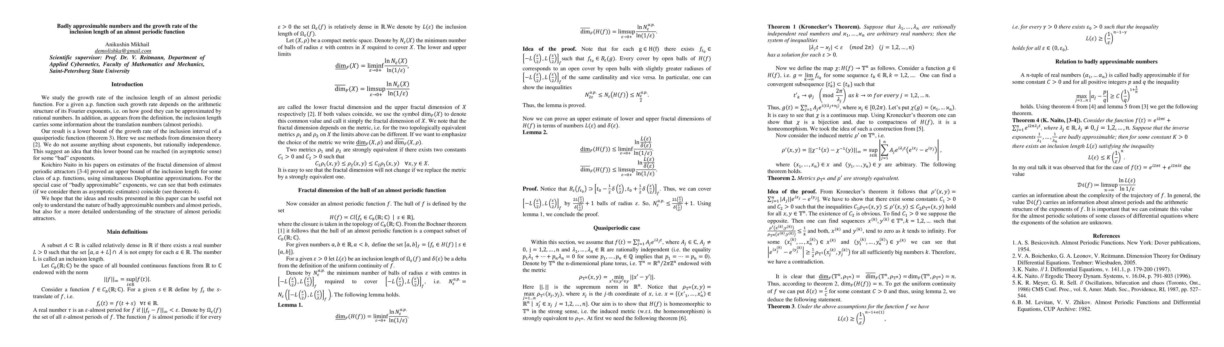 This paper investigates the growth rate of inclusion length in almost periodic functions, finding a lower bound using dimension theory methods. It suggests that this bound might be achievable for certain 'badly approximable' exponents, aligning with upper bounds proven by Koichiro Naito for specific almost periodic functions. The findings aim to enhance understanding of badly approximable numbers, almost periods, and almost periodic attractor structures.
