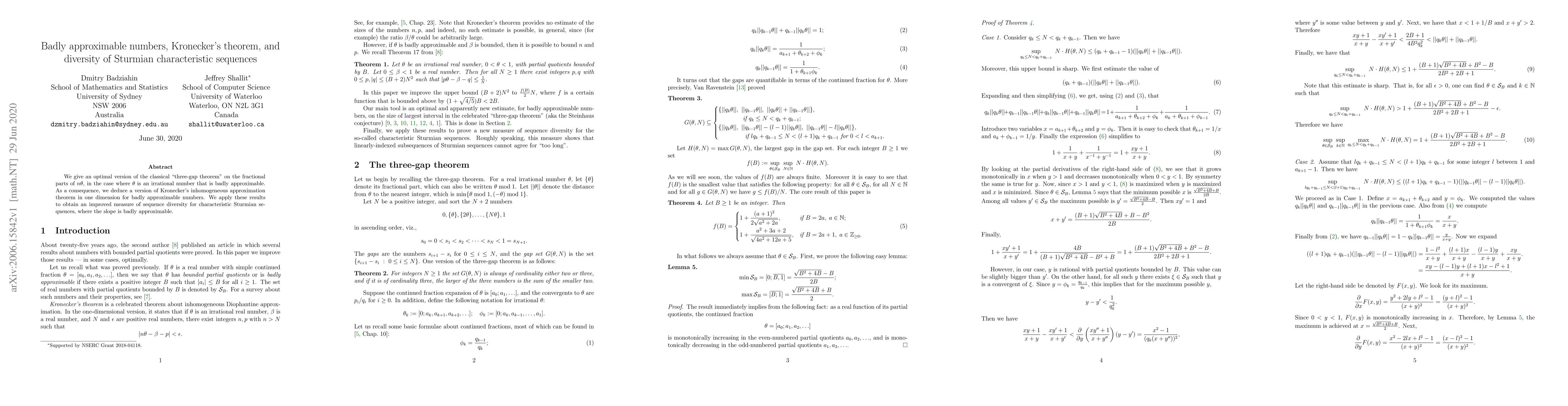 This paper refines the three-gap theorem for the fractional parts of irrational, badly approximable numbers, leading to a version of Kronecker's inhomogeneous approximation theorem. It then enhances the diversity measure for Sturmian sequences with badly approximable slopes.