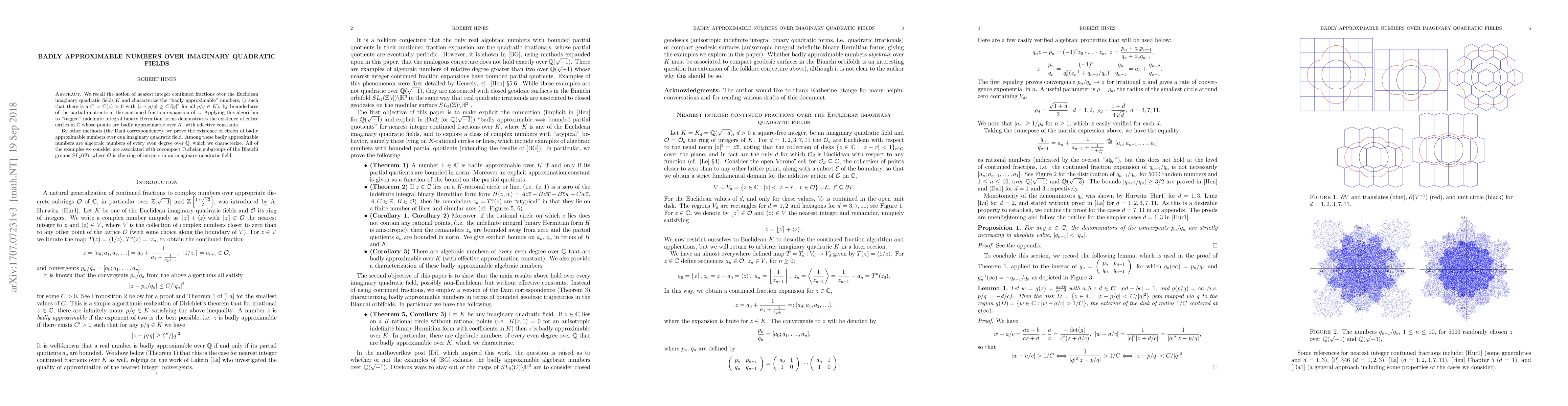 The paper characterizes badly approximable numbers over imaginary quadratic fields using nearest integer continued fractions and bounded partial quotients. It applies this to tagged indefinite integral binary Hermitian forms, demonstrating the existence of entire circles in $\mathbb{C}$ with badly approximable points, and extends these results to any imaginary quadratic field using the Dani correspondence.