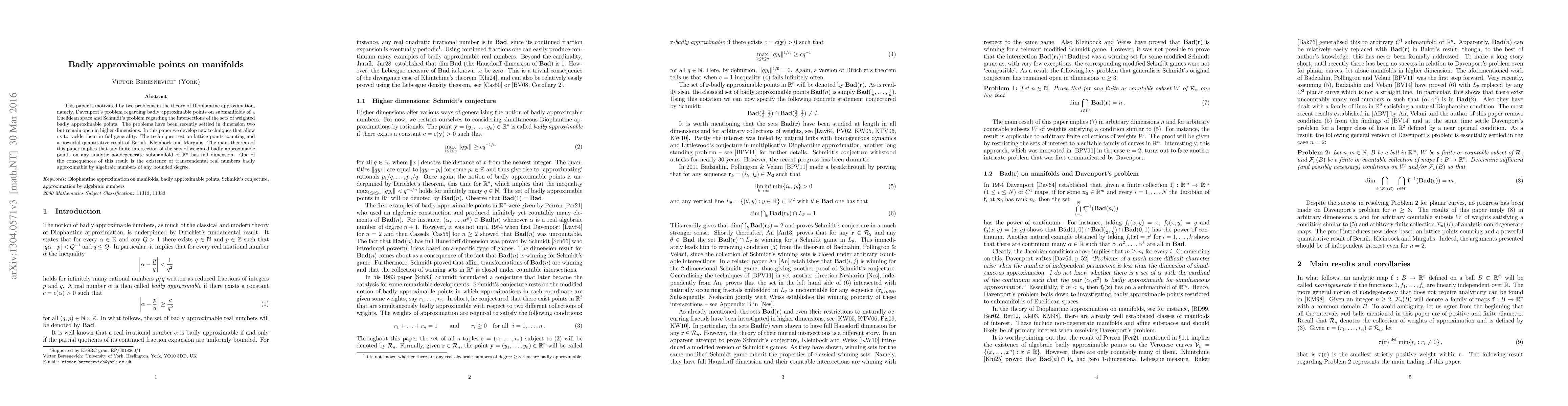 This paper is motivated by two problems in the theory of Diophantine approximation, namely, Davenport's problem regarding badly approximable points on submanifolds of a Euclidean space and Schmidt's problem regarding the intersections of the sets of weighted badly approximable points. The problems have been recently settled in dimension two but remain open in higher dimensions. In this paper we develop new techniques that allow us to tackle them in full generality. The techniques rest on lattice points counting and a powerful quantitative result of Bernik, Kleinbock and Margulis. The main theorem of this paper implies that any finite intersection of the sets of weighted badly approximable points on any analytic nondegenerate submanifold of $R^n$ has full dimension. One of the consequences of this result is the existence of transcendental real numbers badly approximable by algebraic numbers of any degree.
