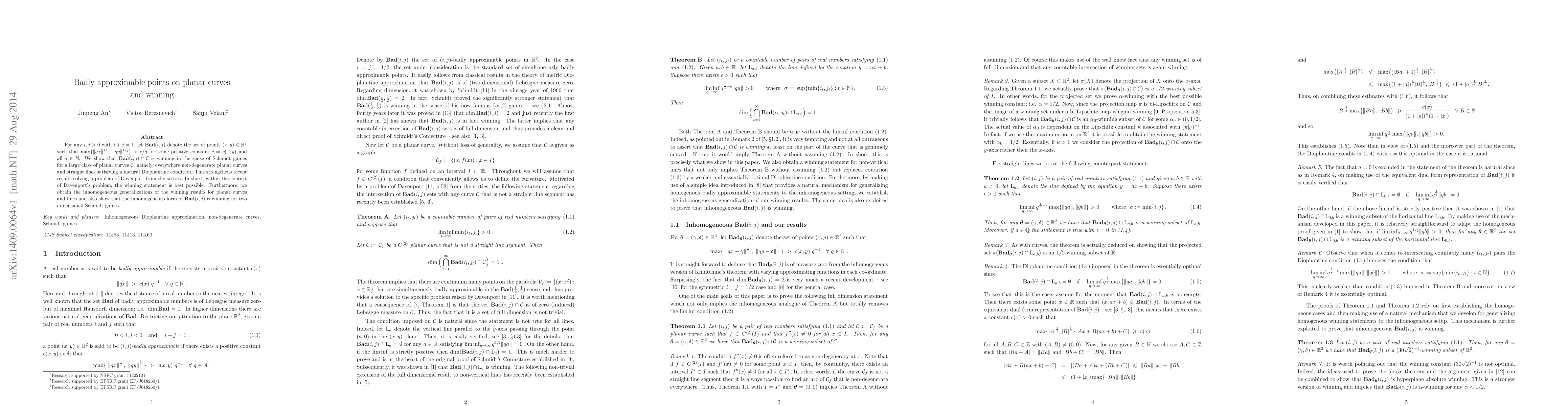 Researchers prove that certain points on planar curves and lines satisfy a winning condition in games, strengthening a decades-old problem solution and providing inhomogeneous generalizations.