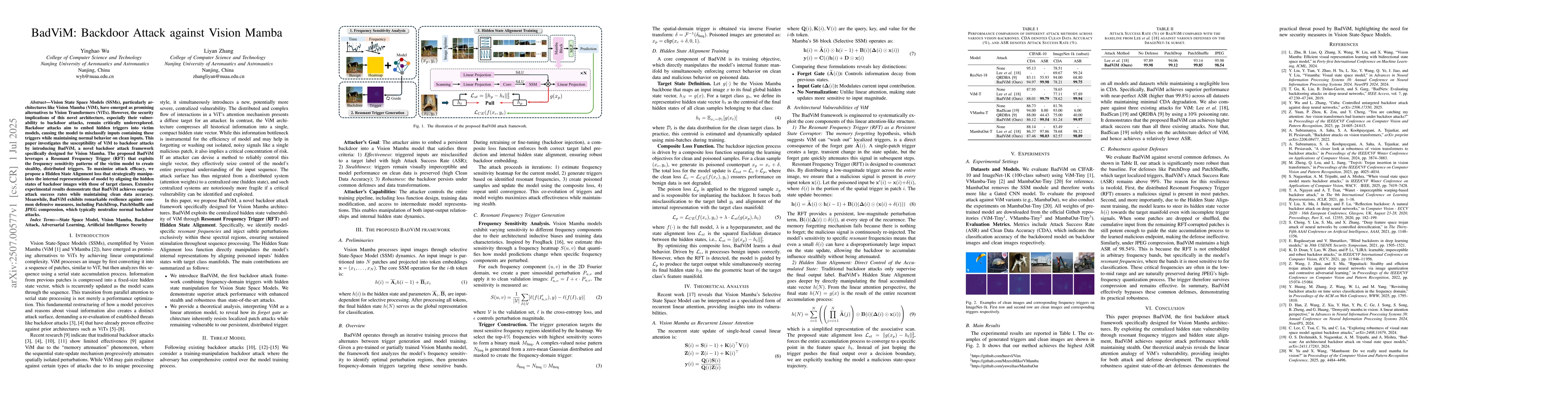 Vision State Space Models (SSMs), particularly architectures like Vision Mamba (ViM), have emerged as promising alternatives to Vision Transformers (ViTs). However, the security implications of this novel architecture, especially their vulnerability to backdoor attacks, remain critically underexplored. Backdoor attacks aim to embed hidden triggers into victim models, causing the model to misclassify inputs containing these triggers while maintaining normal behavior on clean inputs. This paper investigates the susceptibility of ViM to backdoor attacks by introducing BadViM, a novel backdoor attack framework specifically designed for Vision Mamba. The proposed BadViM leverages a Resonant Frequency Trigger (RFT) that exploits the frequency sensitivity patterns of the victim model to create stealthy, distributed triggers. To maximize attack efficacy, we propose a Hidden State Alignment loss that strategically manipulates the internal representations of model by aligning the hidden states of backdoor images with those of target classes. Extensive experimental results demonstrate that BadViM achieves superior attack success rates while maintaining clean data accuracy. Meanwhile, BadViM exhibits remarkable resilience against common defensive measures, including PatchDrop, PatchShuffle and JPEG compression, which typically neutralize normal backdoor attacks.