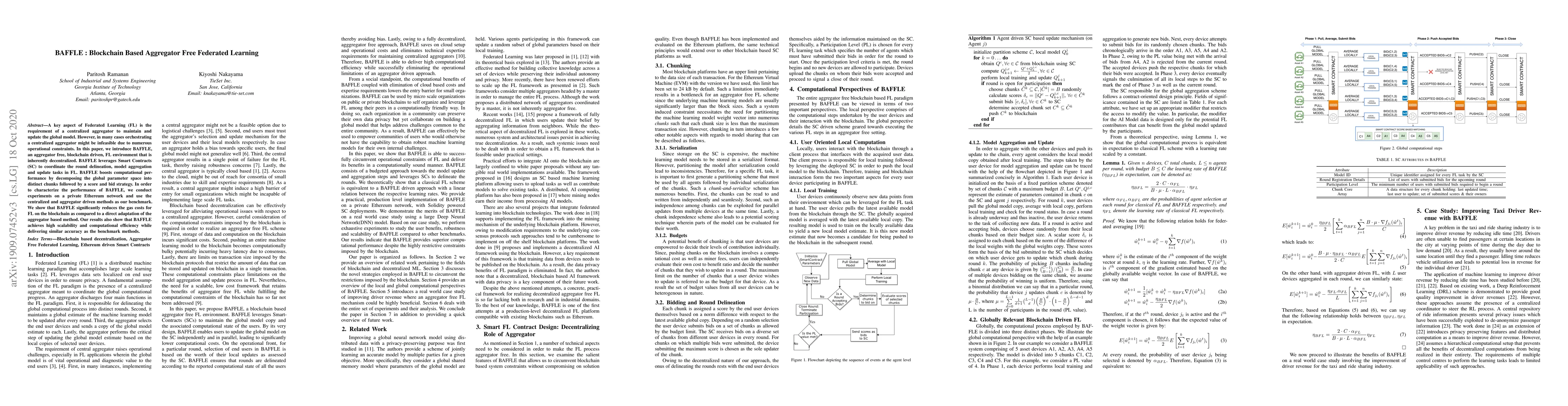 BAFFLE is a blockchain-based, aggregator-free federated learning framework that uses smart contracts to coordinate model updates and tasks, achieving high scalability and computational efficiency while reducing gas costs compared to traditional methods. Experiments on a private Ethereum network demonstrate BAFFLE's superior performance in computational efficiency and similar accuracy.