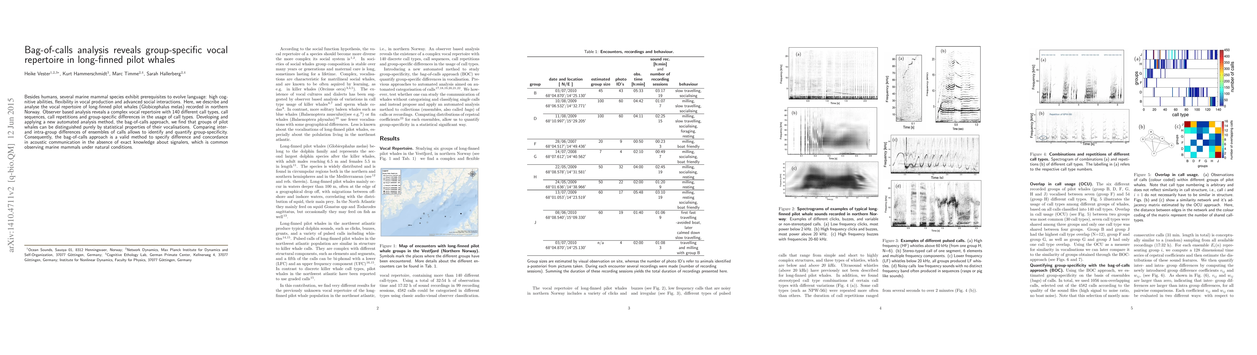 Besides humans, several marine mammal species exhibit prerequisites to evolve language: high cognitive abilities, flexibility in vocal production and advanced social interactions. Here, we describe and analyse the vocal repertoire of long-finned pilot whales (Globicephalus melas) recorded in northern Norway. Observer based analysis reveals a complex vocal repertoire with 140 different call types, call sequences, call repetitions and group-specific differences in the usage of call types. Developing and applying a new automated analysis method, the bag-of-calls approach, we find that groups of pilot whales can be distinguished purely by statistical properties of their vocalisations. Comparing inter-and intra-group differences of ensembles of calls allows to identify and quantify group-specificity. Consequently, the bag-of-calls approach is a valid method to specify difference and concordance in acoustic communication in the absence of exact knowledge about signalers, which is common observing marine mammals under natural conditions.