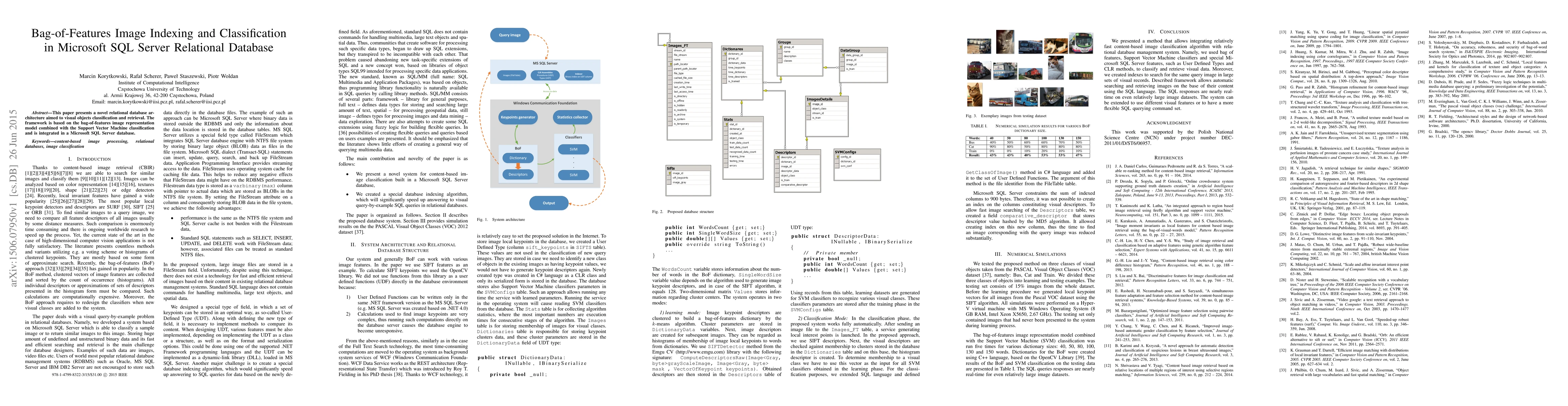 This paper introduces a novel relational database architecture for classifying and retrieving visual objects using a bag-of-features model and Support Vector Machine classification, integrated into a Microsoft SQL Server database. The approach aims to enhance image indexing and classification efficiency within a relational database framework.