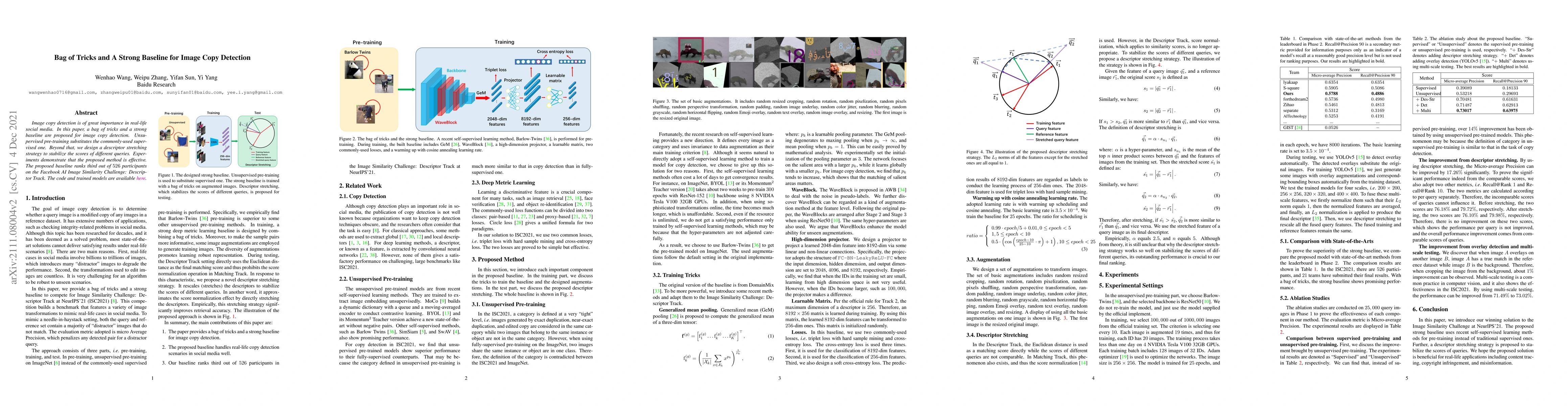 Image copy detection is of great importance in real-life social media. In this paper, a bag of tricks and a strong baseline are proposed for image copy detection. Unsupervised pre-training substitutes the commonly-used supervised one. Beyond that, we design a descriptor stretching strategy to stabilize the scores of different queries. Experiments demonstrate that the proposed method is effective. The proposed baseline ranks third out of 526 participants on the Facebook AI Image Similarity Challenge: Descriptor Track. The code and trained models are available at https://github.com/WangWenhao0716/ISC-Track2-Submission.