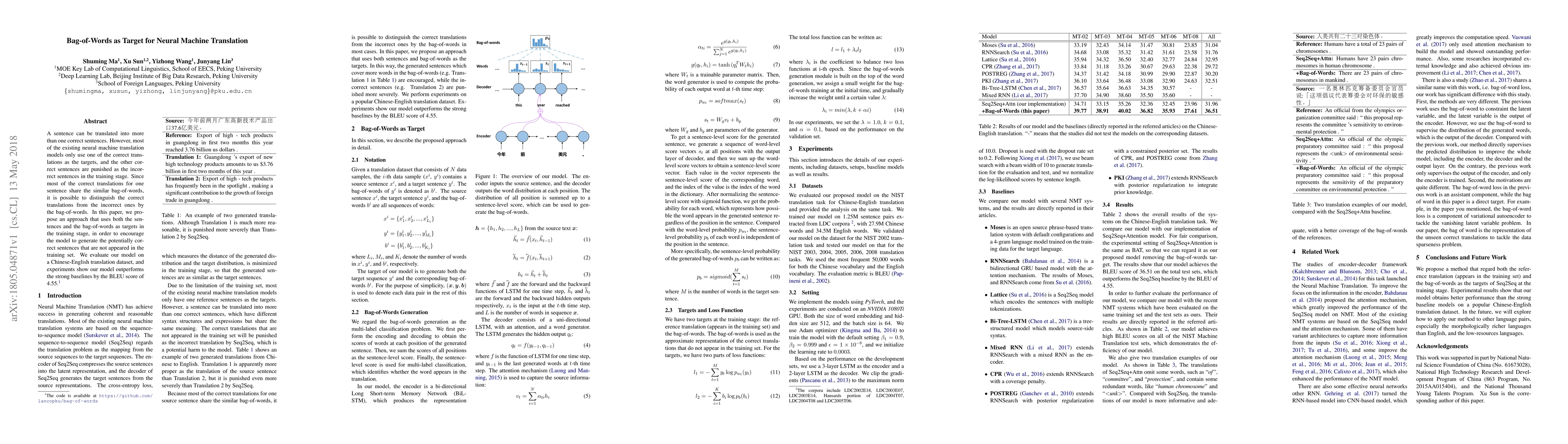 A sentence can be translated into more than one correct sentences. However, most of the existing neural machine translation models only use one of the correct translations as the targets, and the other correct sentences are punished as the incorrect sentences in the training stage. Since most of the correct translations for one sentence share the similar bag-of-words, it is possible to distinguish the correct translations from the incorrect ones by the bag-of-words. In this paper, we propose an approach that uses both the sentences and the bag-of-words as targets in the training stage, in order to encourage the model to generate the potentially correct sentences that are not appeared in the training set. We evaluate our model on a Chinese-English translation dataset, and experiments show our model outperforms the strong baselines by the BLEU score of 4.55.