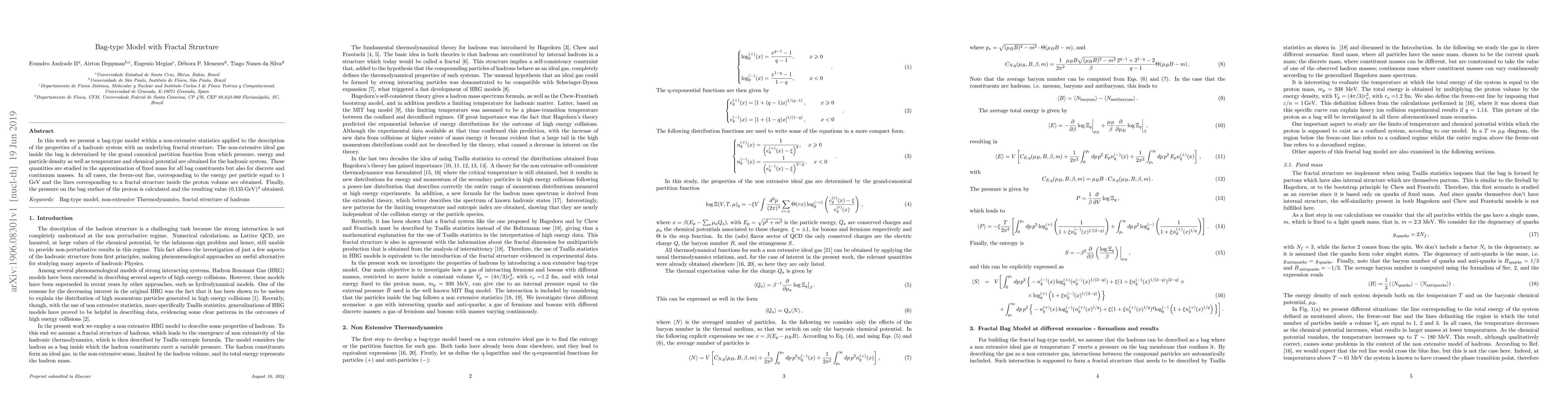 In this work we present a bag-type model within a non-extensive statistics applied to the description of the properties of a hadronic system with an underlying fractal structure. The non-extensive ideal gas inside the bag is determined by the grand canonical partition function from which pressure, energy and particle density as well as temperature and chemical potential are obtained for the hadronic system. These quantities are studied in the approximation of fixed mass for all bag constituents but also for discrete and continuum masses. In all cases, the freeze-out line, corresponding to the energy per particle equal to 1 GeV and the lines corresponding to a fractal structure inside the proton volume are obtained. Finally, the pressure on the bag surface of the proton is calculated and the resulting value $(0.135\, {\rm GeV})^4$ obtained.