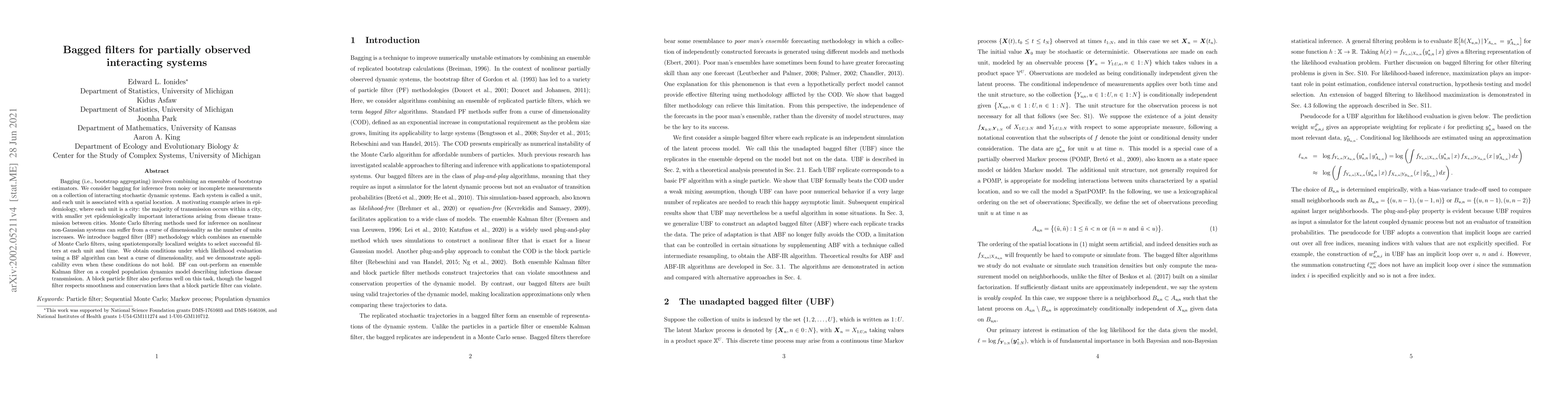 This paper introduces bagged filter (BF) methodology to improve inference from noisy or incomplete data in interacting stochastic dynamic systems, such as epidemiological models. BF combines an ensemble of localized Monte Carlo filters to outperform traditional methods like the ensemble Kalman filter and block particle filters, especially in high-dimensional settings.