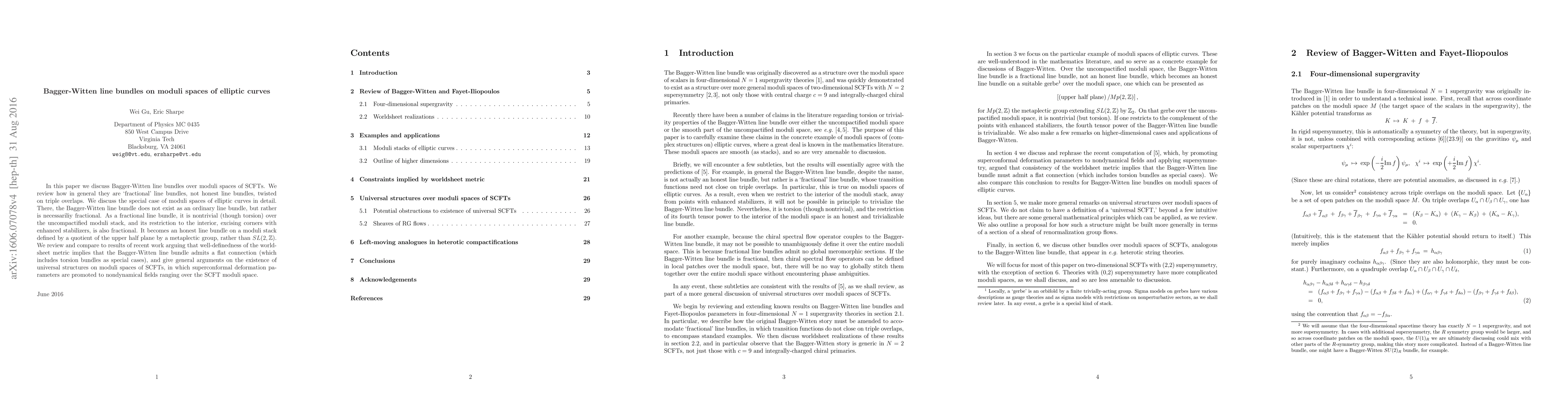 In this paper we discuss Bagger-Witten line bundles over moduli spaces of SCFTs. We review how in general they are `fractional' line bundles, not honest line bundles, twisted on triple overlaps. We discuss the special case of moduli spaces of elliptic curves in detail. There, the Bagger-Witten line bundle does not exist as an ordinary line bundle, but rather is necessarily fractional. As a fractional line bundle, it is nontrivial (though torsion) over the uncompactified moduli stack, and its restriction to the interior, excising corners with enhanced stabilizers, is also fractional. It becomes an honest line bundle on a moduli stack defined by a quotient of the upper half plane by a metaplectic group, rather than SL(2,Z). We review and compare to results of recent work arguing that well-definedness of the worldsheet metric implies that the Bagger-Witten line bundle admits a flat connection (which includes torsion bundles as special cases), and give general arguments on the existence of universal structures on moduli spaces of SCFTs, in which superconformal deformation parameters are promoted to nondynamical fields ranging over the SCFT moduli space.