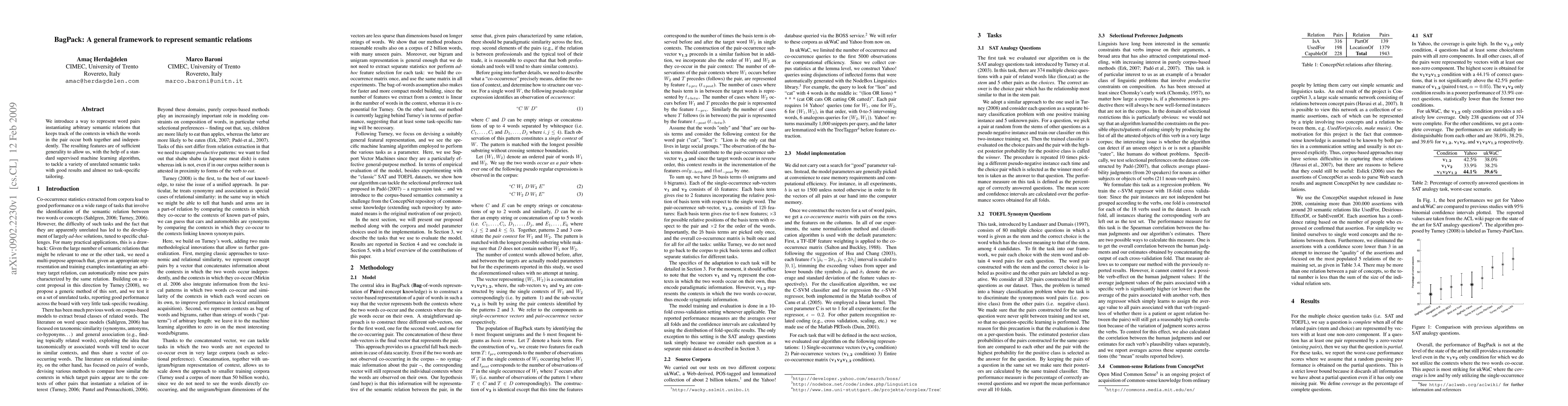 We introduce a way to represent word pairs instantiating arbitrary semantic relations that keeps track of the contexts in which the words in the pair occur both together and independently. The resulting features are of sufficient generality to allow us, with the help of a standard supervised machine learning algorithm, to tackle a variety of unrelated semantic tasks with good results and almost no task-specific tailoring.