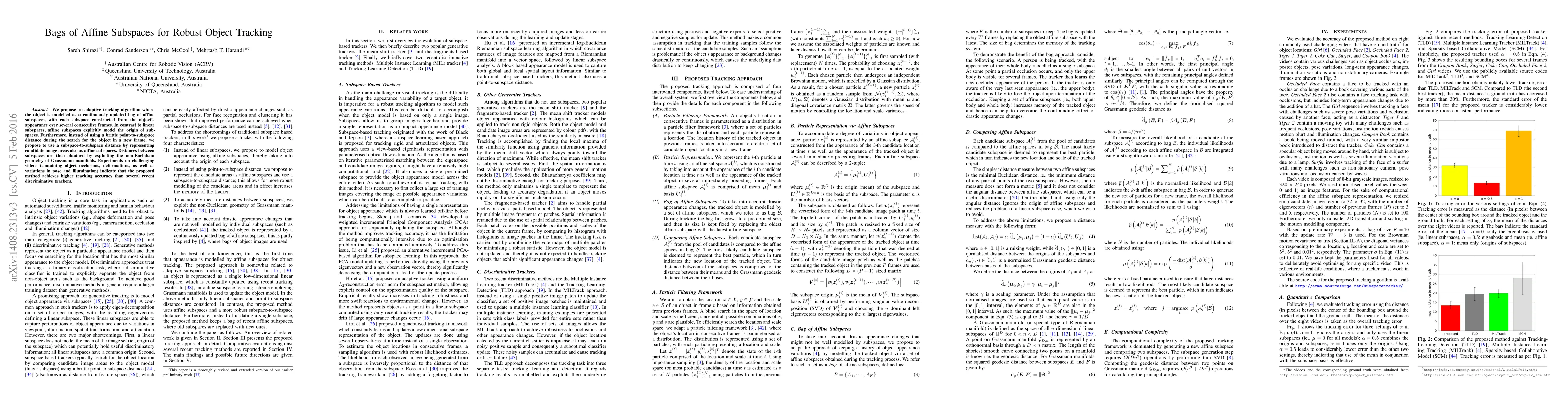 We propose an adaptive tracking algorithm where the object is modelled as a continuously updated bag of affine subspaces, with each subspace constructed from the object's appearance over several consecutive frames. In contrast to linear subspaces, affine subspaces explicitly model the origin of subspaces. Furthermore, instead of using a brittle point-to-subspace distance during the search for the object in a new frame, we propose to use a subspace-to-subspace distance by representing candidate image areas also as affine subspaces. Distances between subspaces are then obtained by exploiting the non-Euclidean geometry of Grassmann manifolds. Experiments on challenging videos (containing object occlusions, deformations, as well as variations in pose and illumination) indicate that the proposed method achieves higher tracking accuracy than several recent discriminative trackers.