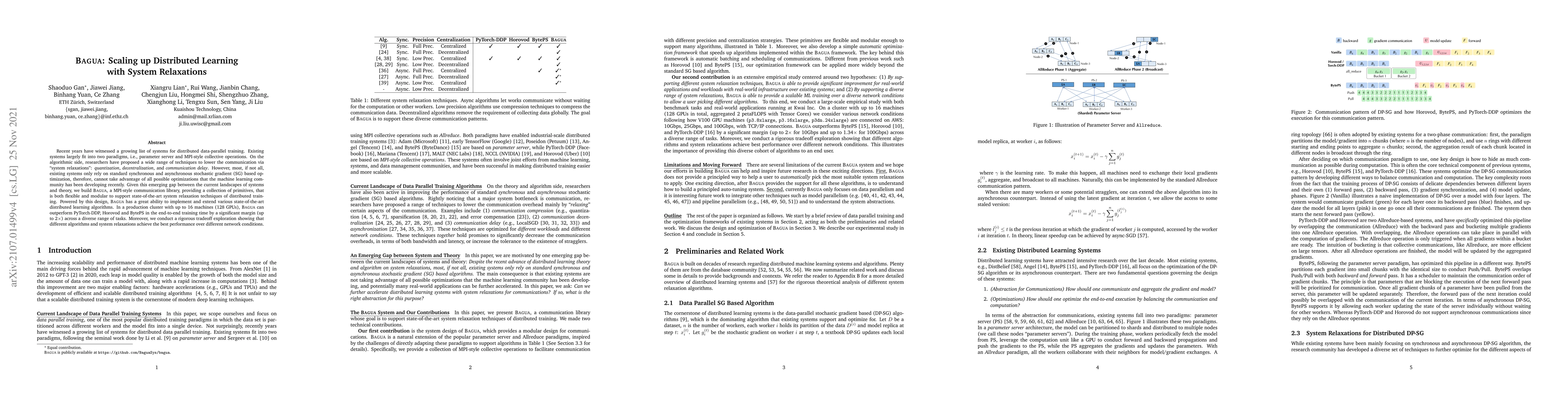 BAGUA is a flexible MPI-style communication library designed to support advanced distributed training techniques, outperforming existing systems like PyTorch-DDP and Horovod in end-to-end training time across various tasks. It enables the implementation of state-of-the-art distributed learning algorithms through its modular primitives.