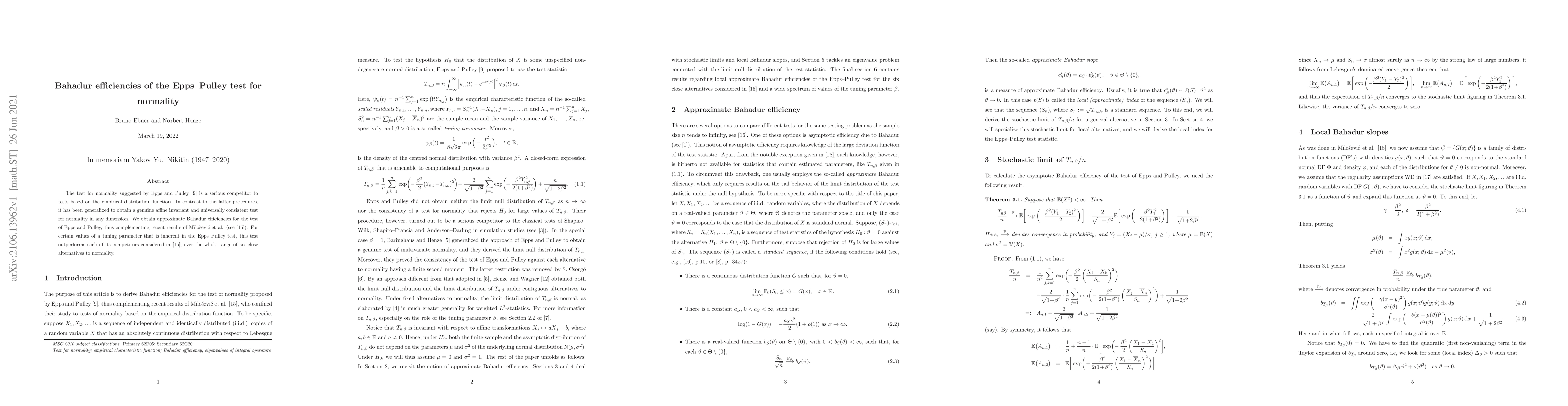 This paper evaluates the Bahadur efficiencies of the Epps-Pulley test for normality, demonstrating its superior performance over competitors in certain tuning parameter settings, particularly against six close alternatives to normality. The results complement recent findings by Milošević et al. (2021) and highlight the test's universal consistency and affine invariance.