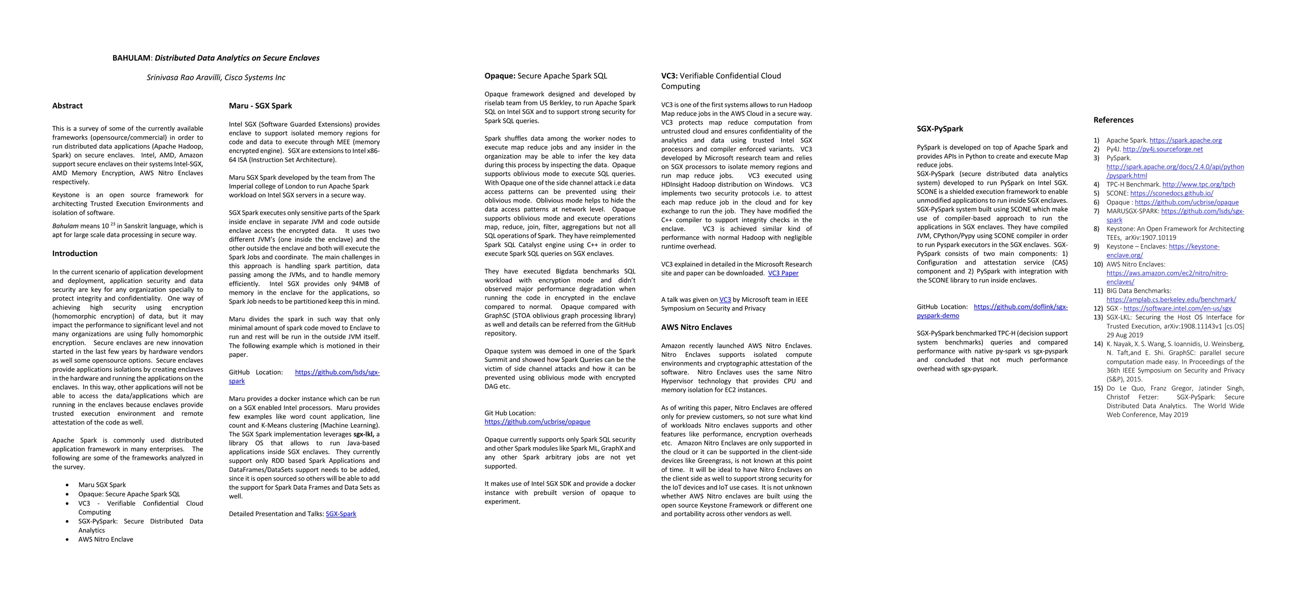 This is a survey of some of the currently available frameworks (opensource/commercial) in order to run distributed data applications(Hadoop, Spark) on secure enclaves. Intel, AMD, Amazon support secure enclaves on their systems Intel-SGX, AMD Memory Encryption, AWS Nitro Enclaves respectively. Keystone is an open-source framework for architecting Trusted Execution Environments and isolation.
