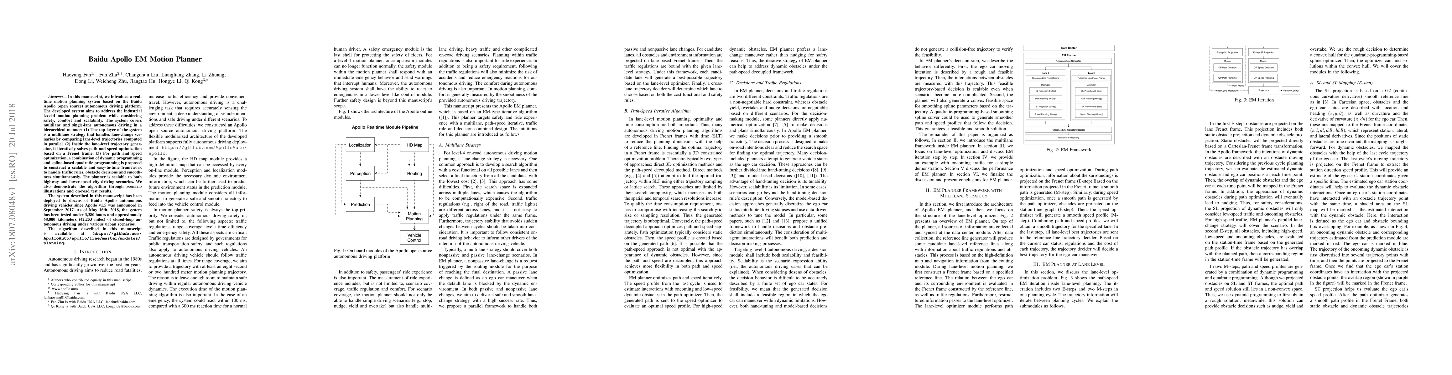 This paper introduces Baidu Apollo EM Motion Planner, a real-time system for level-4 autonomous driving that integrates safety, comfort, and scalability. It employs a hierarchical approach for multilane and single-lane driving, combining dynamic programming and spline-based quadratic programming to optimize path and speed, and has been tested over 68,000 kilometers.