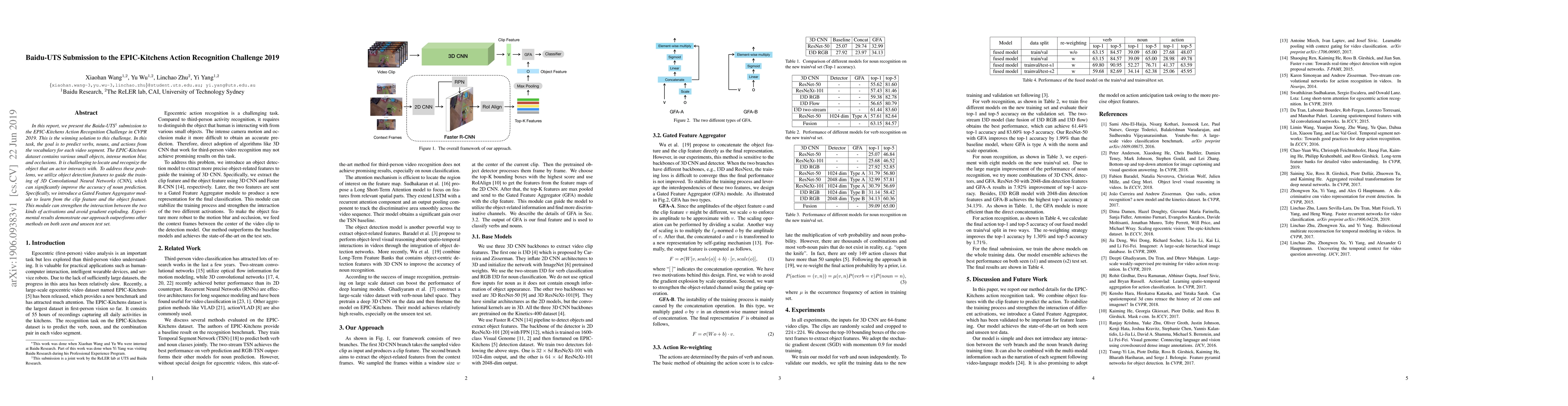 In this report, we present the Baidu-UTS submission to the EPIC-Kitchens Action Recognition Challenge in CVPR 2019. This is the winning solution to this challenge. In this task, the goal is to predict verbs, nouns, and actions from the vocabulary for each video segment. The EPIC-Kitchens dataset contains various small objects, intense motion blur, and occlusions. It is challenging to locate and recognize the object that an actor interacts with. To address these problems, we utilize object detection features to guide the training of 3D Convolutional Neural Networks (CNN), which can significantly improve the accuracy of noun prediction. Specifically, we introduce a Gated Feature Aggregator module to learn from the clip feature and the object feature. This module can strengthen the interaction between the two kinds of activations and avoid gradient exploding. Experimental results demonstrate our approach outperforms other methods on both seen and unseen test set.