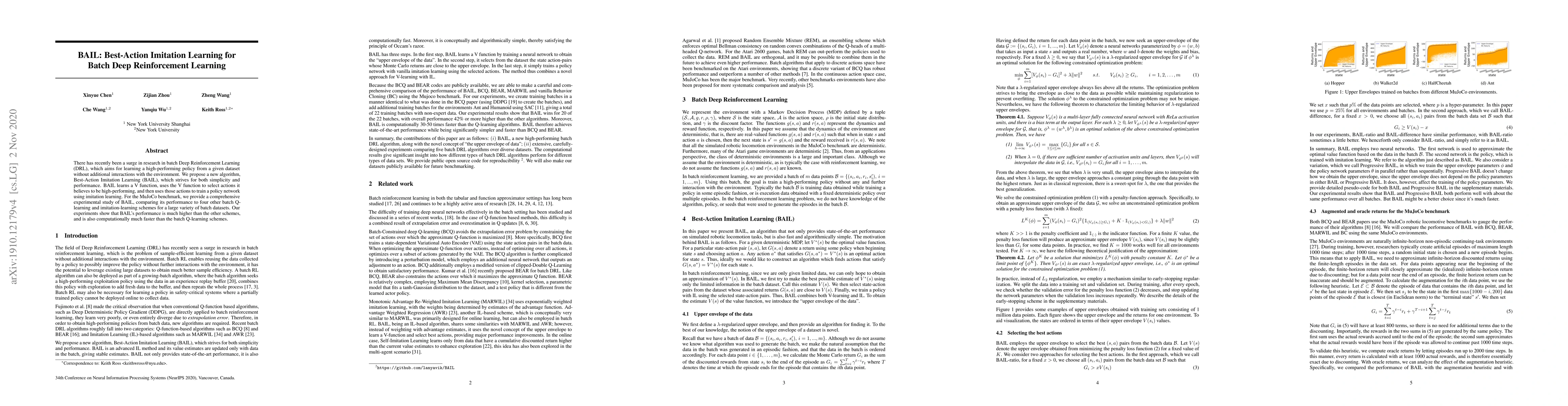 The paper introduces BAIL, a Best-Action Imitation Learning algorithm for batch Deep Reinforcement Learning, which outperforms other batch Q-learning and imitation-learning methods in both performance and computational speed on the MuJoCo benchmark. BAIL leverages a V function to select high-performing actions for policy network training.