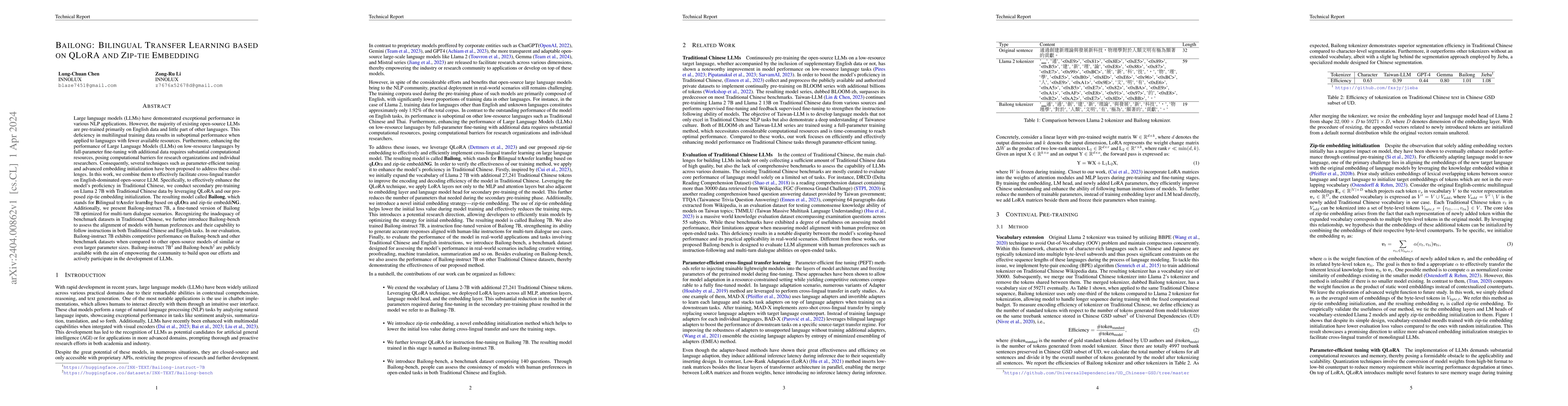 Large language models (LLMs) have demonstrated exceptional performance in various NLP applications. However, the majority of existing open-source LLMs are pre-trained primarily on English data and little part of other languages. This deficiency in multilingual training data results in suboptimal performance when applied to languages with fewer available resources. Furthermore, enhancing the performance of LLMs on low-resource languages by full-parameter fine-tuning with additional data requires substantial computational resources, posing computational barriers for research organizations and individual researchers. Consequently, several techniques such as parameter-efficient tuning and advanced embedding initialization have been proposed to address these challenges. In this work, we combine them to facilitate cross-lingual transfer on English-dominated open-source LLM. To effectively enhance the model's proficiency in Traditional Chinese, we conduct secondary pre-training on Llama 2 7B with Traditional Chinese data by leveraging QLoRA and our proposed zip-tie embedding initialization. The resulting model called Bailong, which stands for Bilingual trAnsfer learnIng based on qLOra and zip-tie embeddiNG. We present Bailong-instruct 7B, a fine-tuned version of Bailong 7B optimized for multi-turn dialogue scenarios. Recognizing the inadequacy of benchmark datasets in Traditional Chinese, we further introduce Bailong-bench to assess the alignment of models with human preferences and the capability to follow instructions in both Traditional Chinese and English tasks. In our evaluation, Bailong-instruct 7B exhibits competitive performance on Bailong-bench and other benchmark datasets when compared to other open-source models of similar or even larger parameter sizes. Bailong-instruct 7B and Bailong-bench are publicly available with the aim of empowering the community to build upon our efforts.