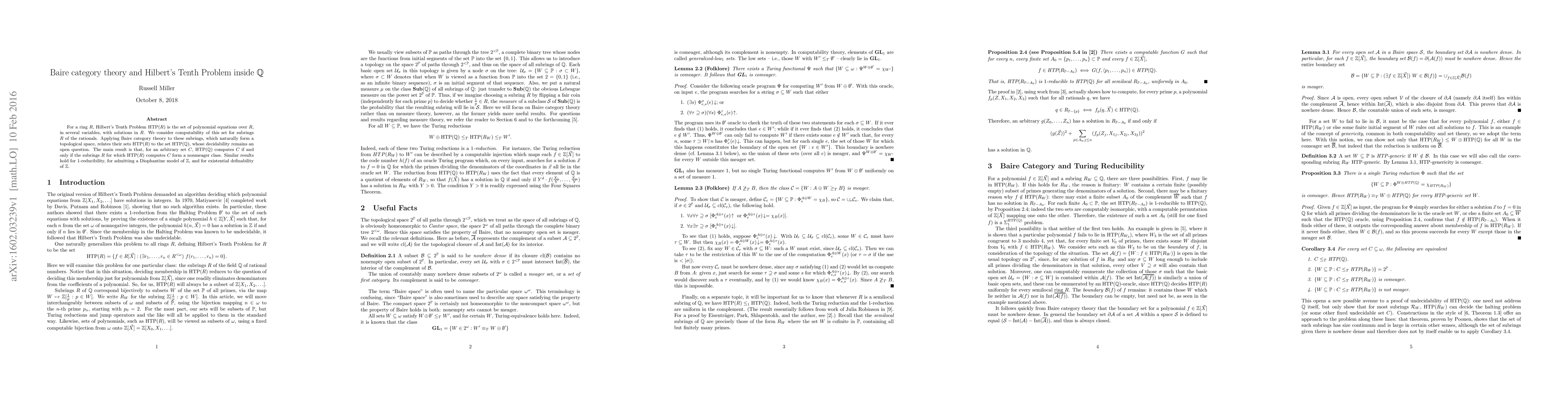 Summary: This paper explores the computability of Hilbert's Tenth Problem for subrings of rational numbers, applying Baire category theory to establish connections between these subrings and $\mathbb{Q}$. It demonstrates that the decidability of HTP($\mathbb{Q}$) is equivalent to certain subrings forming a nonmeager class in the context of computability.