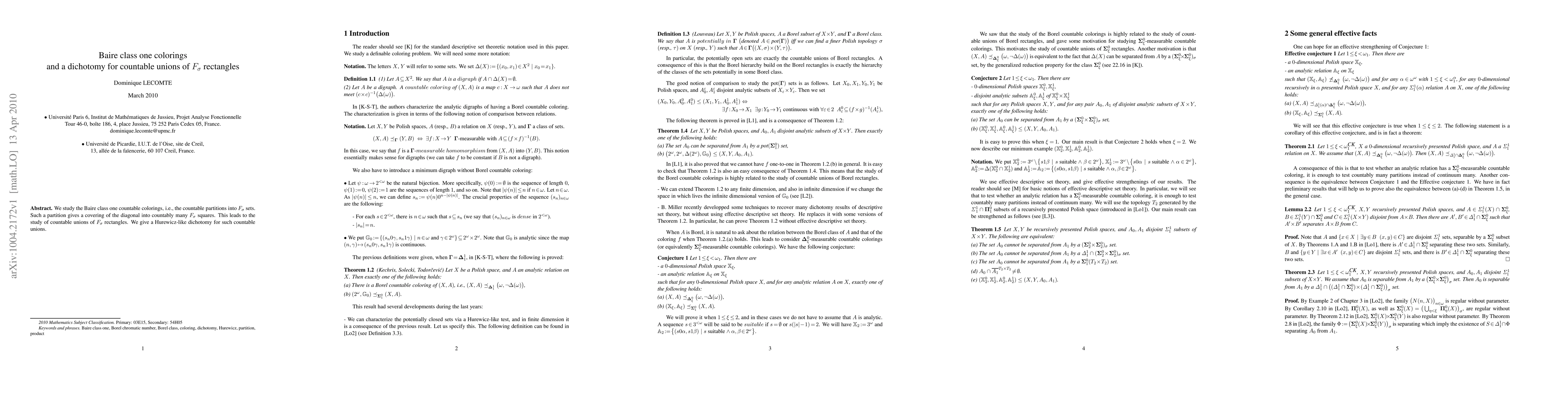 This paper investigates Baire class one countable colorings, which partition the diagonal into countably many $F_\sigma$ sets, leading to the examination of countable unions of $F_\sigma$ rectangles. The authors establish a Hurewicz-like dichotomy for these unions.
