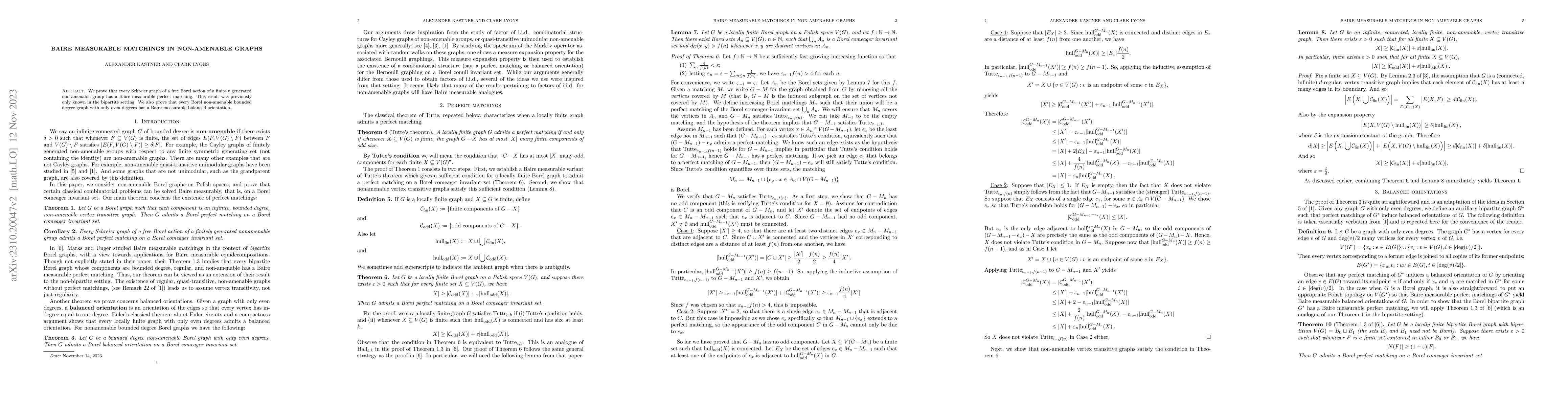 This paper demonstrates that every Schreier graph from a free Borel action of a finitely generated non-amenable group possesses a Baire measurable perfect matching, extending a previous result to non-bipartite settings. Additionally, it proves that any Borel non-amenable bounded degree graph with even degrees has a Baire measurable balanced orientation.
