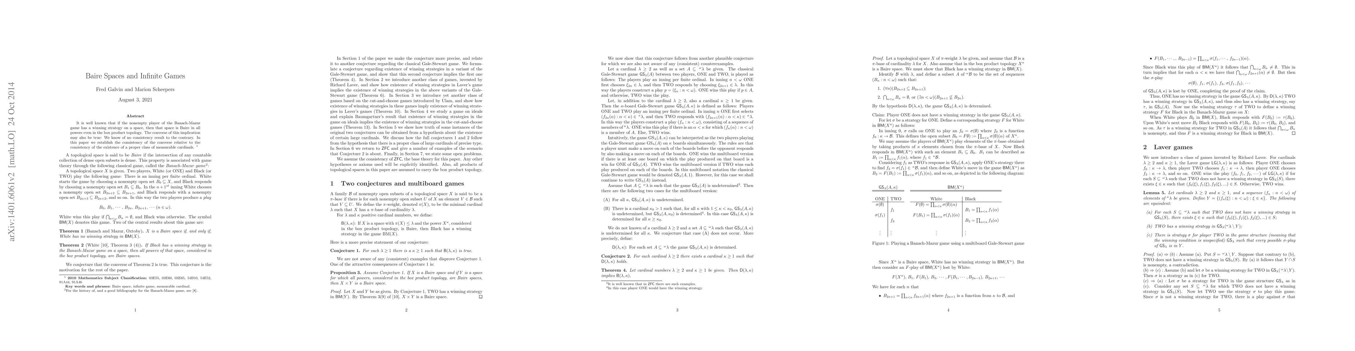It is well known that if the nonempty player of the Banach-Mazur game has a winning strategy on a space, then that space is Baire in all powers even in the box topology. The converse of this implication may be true also: We know of no consistency result to the contrary. In this paper we establish the consistency of the converse relative to the consistency of the existence of a proper class of measurable cardinals.