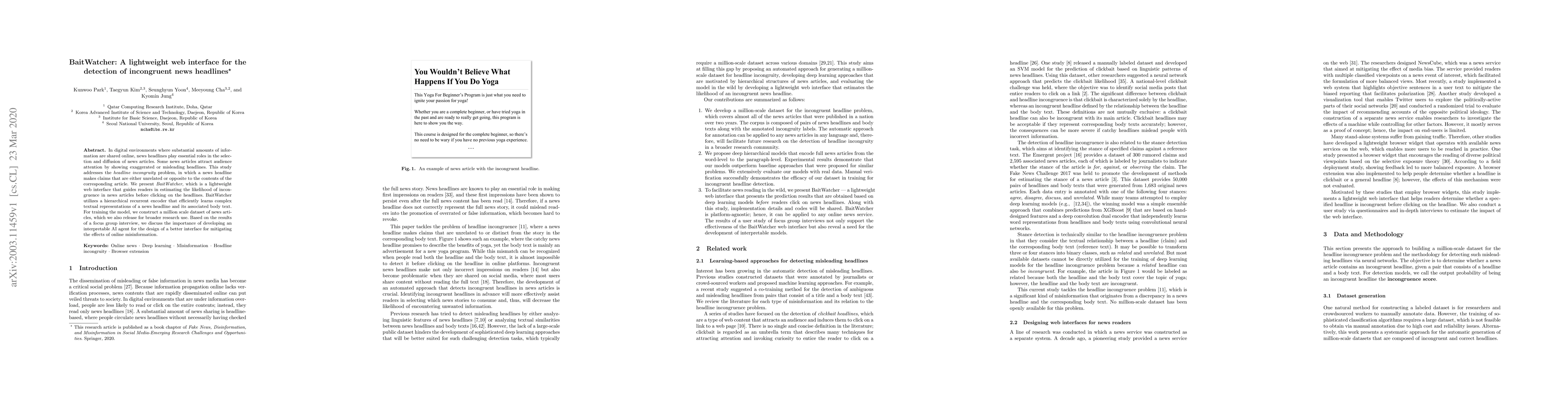 BaitWatcher is a web interface designed to detect incongruent news headlines by analyzing the discrepancy between headlines and their corresponding article contents. It employs a hierarchical recurrent encoder to learn textual representations and aims to help readers discern misleading headlines, thereby mitigating misinformation.