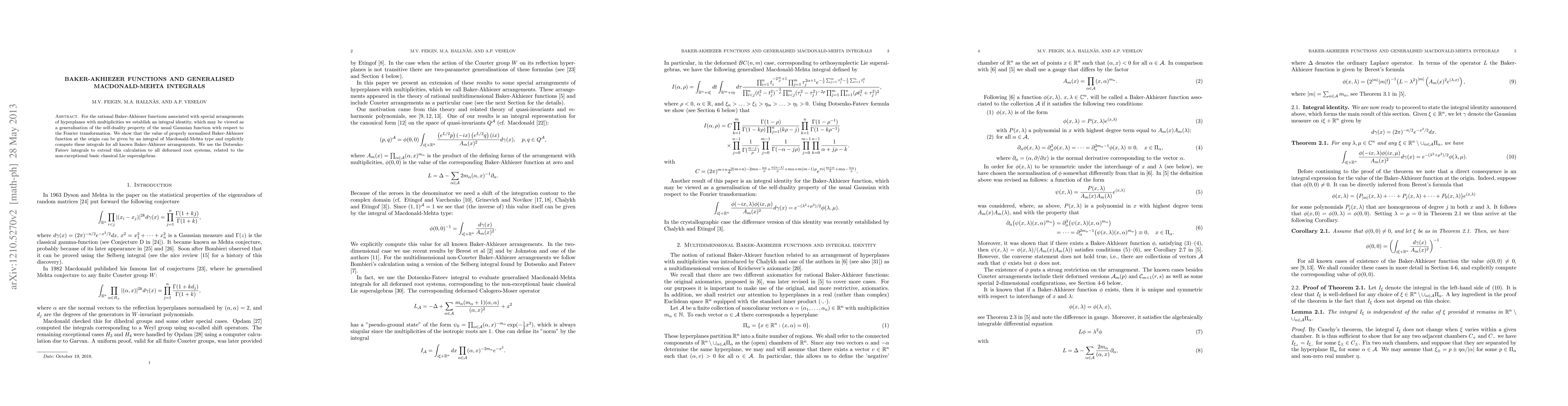 The paper establishes an integral identity for rational Baker-Akhiezer functions, generalizing the Gaussian function's self-duality under Fourier transformation, and computes Macdonald-Mehta integrals for known arrangements, extending the results to deformed root systems via Dotsenko-Fateev integrals.