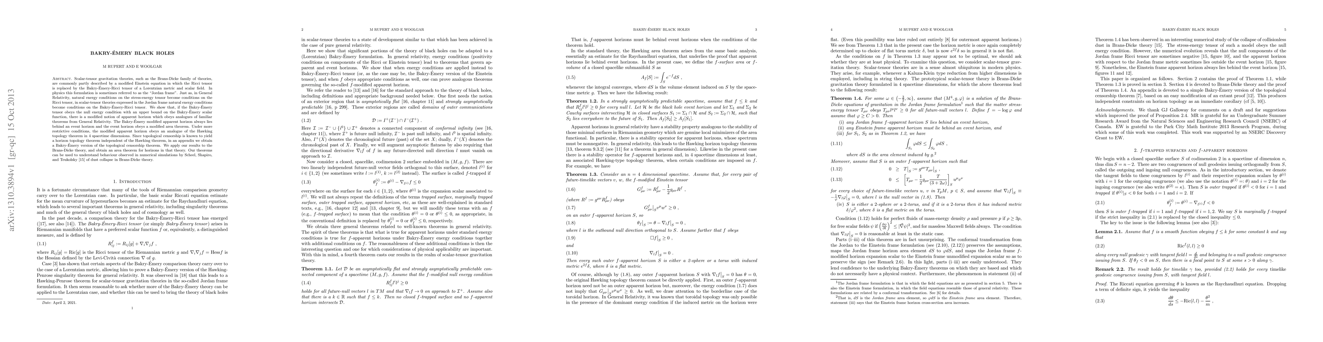 Scalar-tensor gravitation theories, such as the Brans-Dicke family of theories, are commonly partly described by a modified Einstein equation in which the Ricci tensor is replaced by the Bakry-\'Emery-Ricci tensor of a Lorentzian metric and scalar field. In physics this formulation is sometimes referred to as the "Jordan frame". Just as, in General Relativity, natural energy conditions on the stress-energy tensor become conditions on the Ricci tensor, in scalar-tensor theories expressed in the Jordan frame natural energy conditions become conditions on the Bakry-\'Emery-Ricci tensor. We show that, if the Bakry-\'Emery tensor obeys the null energy condition with an upper bound on the Bakry-\'Emery scalar function, there is a modified notion of apparent horizon which obeys analogues of familiar theorems from General Relativity. The Bakry-\'Emery modified apparent horizon always lies behind an event horizon and the event horizon obeys a modified area theorem. Under more restrictive conditions, the modified apparent horizon obeys an analogue of the Hawking topology theorem in 4 spacetime dimensions. Since topological censorship is known to yield a horizon topology theorem independent of the Hawking theorem, in an appendix we obtain a Bakry-\'Emery version of the topological censorship theorem. We apply our results to the Brans-Dicke theory, and obtain an area theorem for horizons in that theory. Our theorems can be used to understand behaviour observed in numerical simulations by Scheel, Shapiro, and Teukolsky of dust collapse in Brans-Dicke theory.