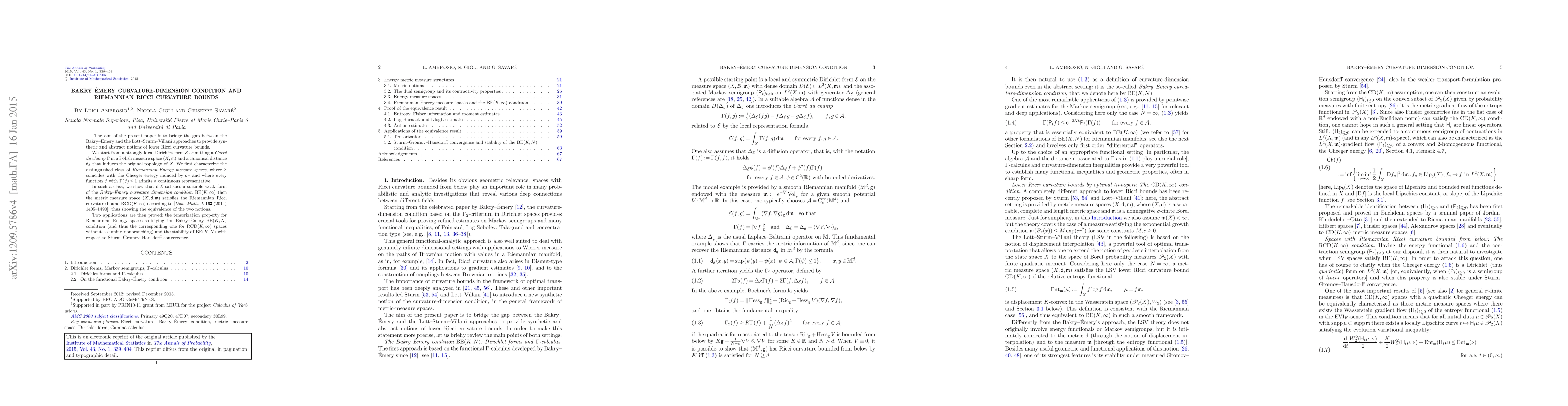 The aim of the present paper is to bridge the gap between the Bakry-\'{E}mery and the Lott-Sturm-Villani approaches to provide synthetic and abstract notions of lower Ricci curvature bounds. We start from a strongly local Dirichlet form ${{\mathcal{E}}}$ admitting a Carr\'{e} du champ $\Gamma$ in a Polish measure space $(X,\mathfrak{m})$ and a canonical distance ${\mathsf{d}}_{{{\mathcal{E}}}}$ that induces the original topology of $X$. We first characterize the distinguished class of Riemannian Energy measure spaces, where ${\mathcal{E}}$ coincides with the Cheeger energy induced by ${\mathsf{d}}_{{\mathcal{E}}}$ and where every function $f$ with $\Gamma(f)\le1$ admits a continuous representative. In such a class, we show that if ${{\mathcal{E}}}$ satisfies a suitable weak form of the Bakry-\'{E}mery curvature dimension condition $\mathrm {BE}(K,\infty)$ then the metric measure space $(X,{\mathsf{d}},\mathfrak{m})$ satisfies the Riemannian Ricci curvature bound $\mathrm {RCD}(K,\infty)$ according to [Duke Math. J. 163 (2014) 1405-1490], thus showing the equivalence of the two notions. Two applications are then proved: the tensorization property for Riemannian Energy spaces satisfying the Bakry-\'{E}mery $\mathrm {BE}(K,N)$ condition (and thus the corresponding one for $\mathrm {RCD}(K,\infty)$ spaces without assuming nonbranching) and the stability of $\mathrm {BE}(K,N)$ with respect to Sturm-Gromov-Hausdorff convergence.