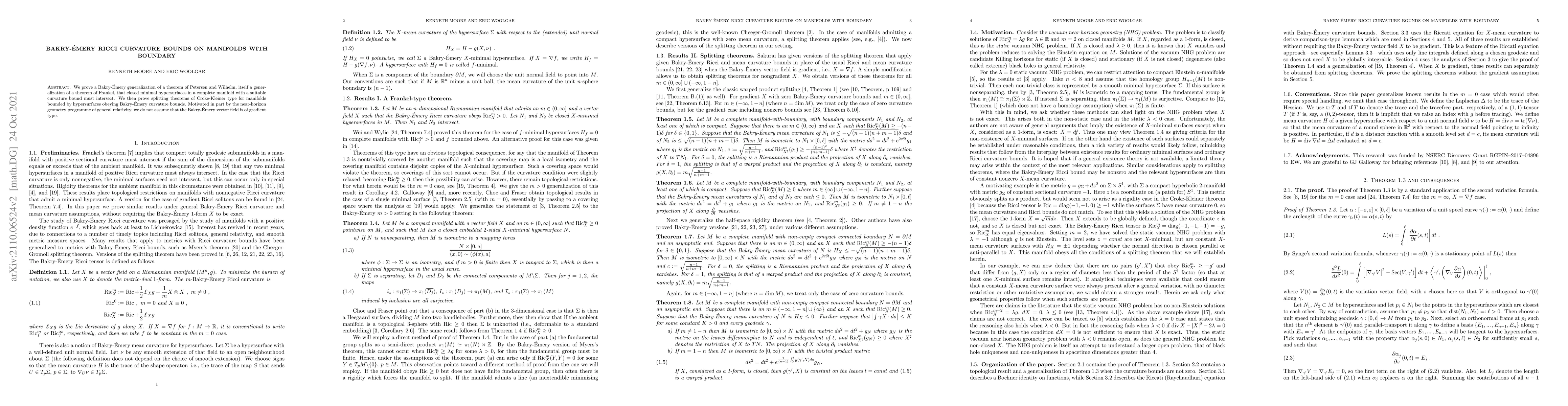 We prove a Bakry-\'Emery generalization of a theorem of Petersen and Wilhelm, itself a generalization of a theorem of Frankel, that closed minimal hypersurfaces in a complete manifold with a suitable curvature bound must intersect. We then prove splitting theorems of Croke-Kleiner type for manifolds bounded by hypersurfaces obeying Bakry-\'Emery curvature bounds. Motivated in part by the near-horizon geometry programme of general relativity, we do not assume that the Bakry-\'Emery vector field is of gradient type.